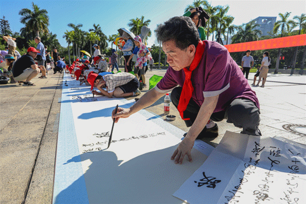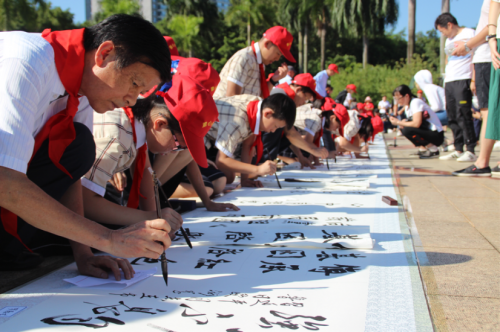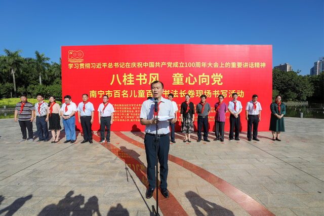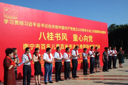 为弘扬爱国主义精神,传承中国优秀传统文化,树立“八桂书风”品牌形象,培养少年儿童爱党爱国之心,用书法艺术的形式书写共产党百年伟业。7月13日,“八桂书风 童心向党”——南宁市百名儿童百米书法长卷现场书写活动在南宁市南湖公园三月三广场举行。 ![]() 南宁市百名儿童百米书法长卷现场书写活动出席的领导嘉宾 张春梅/摄影 ![]() 南宁市百名儿童百米书法长卷现场书写活动现场 卢伊琳/摄影 此次活动由广西文联、广西书法家协会、南宁市文联共同主办,南宁市书法家协会、南宁市少年儿童图书馆、南宁市工人文化宫、南宁市南湖公园、南宁市书羽艺术培训学校承办。 当天上午,广西、南宁市、青秀区、兴宁区文联、书法家协会、文艺志愿者协会、教育局,南宁市少年儿童图书馆、南宁市工人文化宫等单位及社会各界、新闻媒体,以及在邕区、市“兰亭小学”、“书法成长课堂”的老师、学生和家长参加了此次活动。 ![]() 广西文联党组书记严霜宣布百米书法长卷现场书写活动开笔 张春梅/摄影 ![]() 南宁市文联党组书记、主席程小华致辞 卢伊琳/摄影 活动现场, 240多名学生和书法家现场同台挥毫泼墨,共同完成180米书法长卷。书写内容涵盖人民幸福生活、壮美家乡等。一句句情透纸背的诗词联句、格言名言跃然纸上,孩子和书法家们将满腔爱党爱国之情倾注笔端,把崇高的敬意和饱满的热情通过手中的毛笔,表达对党、对国家、对人民、对新时代的赞美和祝福。 ![]() 南宁市百名儿童百米书法长卷现场书写活动现场 张春梅/摄影 ![]() 南宁市百名儿童百米书法长卷现场书写活动现场 卢伊琳/摄影 近年来,为继承和弘扬中华民族的优秀传统文化,南宁市积极推进“书法进校园”等一系列主题文艺志愿服务活动。自2015年公益性书法教育课堂——南宁市少年儿童“书法成长课堂”开办以来,共开办有青秀区、西乡塘区、兴宁区3个教学点,培训学生600多人。同时,南宁市书协积极推动南宁市中小学申报创建“兰亭学校”,目前已有7所学校得到自治区命名,4所学校获得南宁市级命名。 ![]() 南宁市文联主席程小华在致辞中说:“书法艺术是中国传统文化的瑰宝,炎黄子孙的血脉。书法在继承中国传统文化中发挥最直接、最便捷的作用,在时代大潮中走在前列,将会成为一种时代风尚,成为每一个孩子的骄傲。” ![]() 此次活动特别邀请了在邕的老中青书法家到现场共同挥毫,潘琦先生为手卷题写序言,韦克义先生题写跋语,记录了本次活动的内涵和意义,体现了八桂书风薪火相传,文化兴邦培根铸魂。今天的活动,相信在每一个孩子成长的人生旅途上,将是非常难忘而有意义的一天。 据介绍,此次活动完成的书法长卷将在市文化宫展厅进行展出。 文稿:张春梅 编辑:真子 |