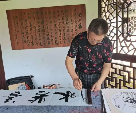 特邀嘉宾、书画家徐惠中先生在半山半水半书窗亭内现场创作书画作品
