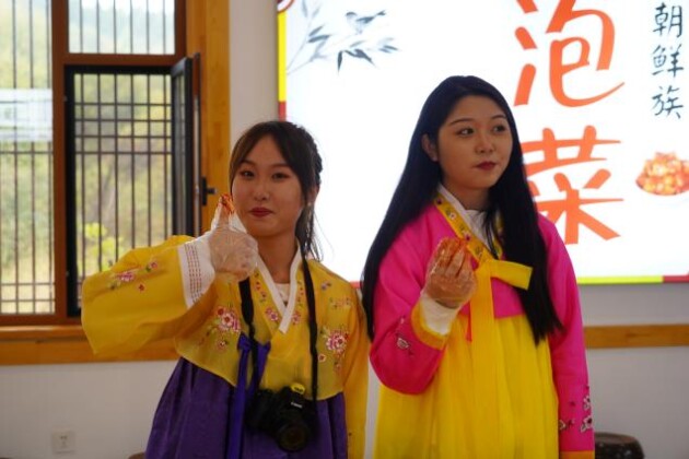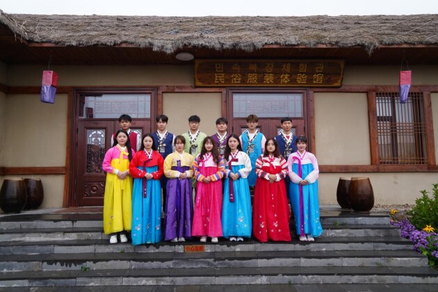 第一天的旅程,大学生们便对科技的发达、大自然的美好心生敬畏。他们开始期待第二天会有什么样的故事发生······ 绵绵的秋雨打湿了还未凋零的花朵;风,轻轻地吹着,一片花瓣像翩翩的蝴蝶慢慢地着落在地上。大学生们摇身一变,成了长白山百花谷朝鲜族古村落最亮丽的风景线。俊俏的少年,温婉的姑娘穿着朝鲜族服饰走在村落中,了解着民族的文化。