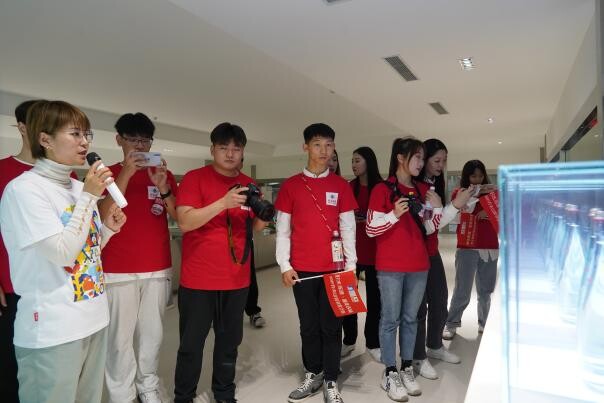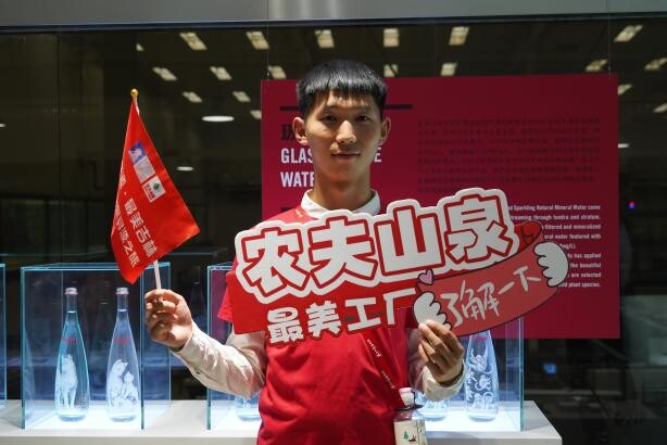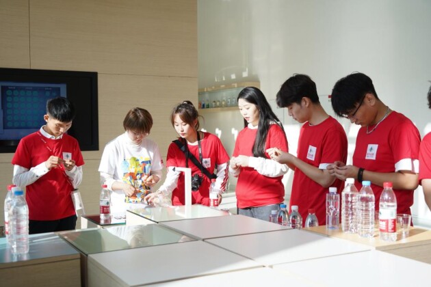 跟随着讲解员的脚步,大学生们还看到了专为孩子们运动时设计,即使瓶盖没盖,水也不会流出来的运动盖水以及瓶身图案由国外顶尖设计师设计的玻璃瓶水。