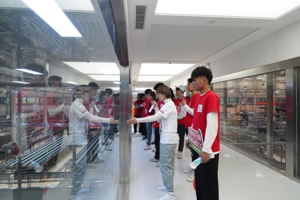 进入生产线的参观走廊,整齐划一的无菌自动化生产线让大学生们停住了前进的脚步,纷纷被现代化科技所震慑!这是无菌水线,也叫母婴水生产线。