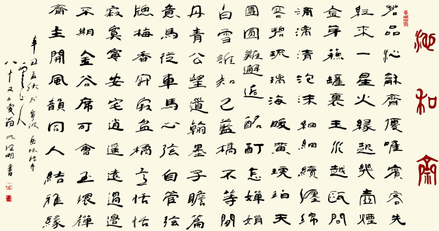 谈及隶书习成,必有碑作根本。林理明的隶书,取法西汉隶的高古气质,参意进篆书的金石气度,写得一波三折过,各点万般态!又有东汉隶的雅趣俊逸,毫无粗糙之感,字字都是丰姿多神的表现,尽有汉隶十碑参意之功,可展汉韵洒脱之妙。更为可贵的是,林理明的隶书带入了行书的运笔意念,写出了顾盼飞仪、牵丝映带的别臻趣味,字字生动活泼,强调了笔墨的书写效果,点线塑造深具灵动,把隶书写出了形神兼备的好气象。仰观其隶,有如卧者,有如奔者,有如跳,有如驰!借古开今书“林隶”,亘古未见第一笔!已然是与众不同,独具法门!