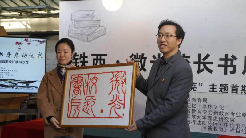 沙龙活动中,十余位校长也进行了读书分享。辽宁省美术家协会理事、沈阳书画院书画家张广茂先生为“铁西·微光校长书房”题字,辽宁省书法家协会会员、著名篆刻师张金波女士为微光校长书房赠送赠送小篆朱文形式纂刻作品。