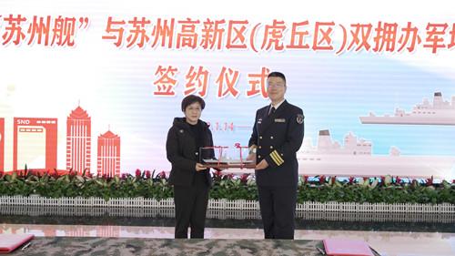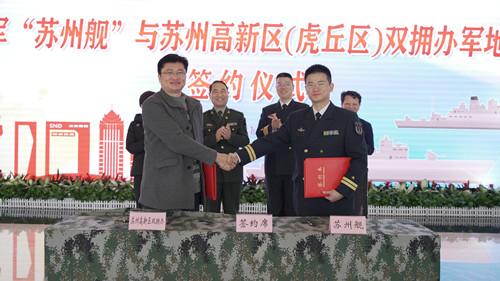 1月14日下午,海军“苏州舰”与苏州高新区(虎丘区)双拥办军地共建签约仪式在高新区展示馆举行。海军“苏州舰”政治委员史善明、副政治委员汤磊,区领导梅海建、赵红,区退役军人事务局局长钦纳新、副局长黄海等军地领导和部分海军官兵,共同见证了这一重要时刻。