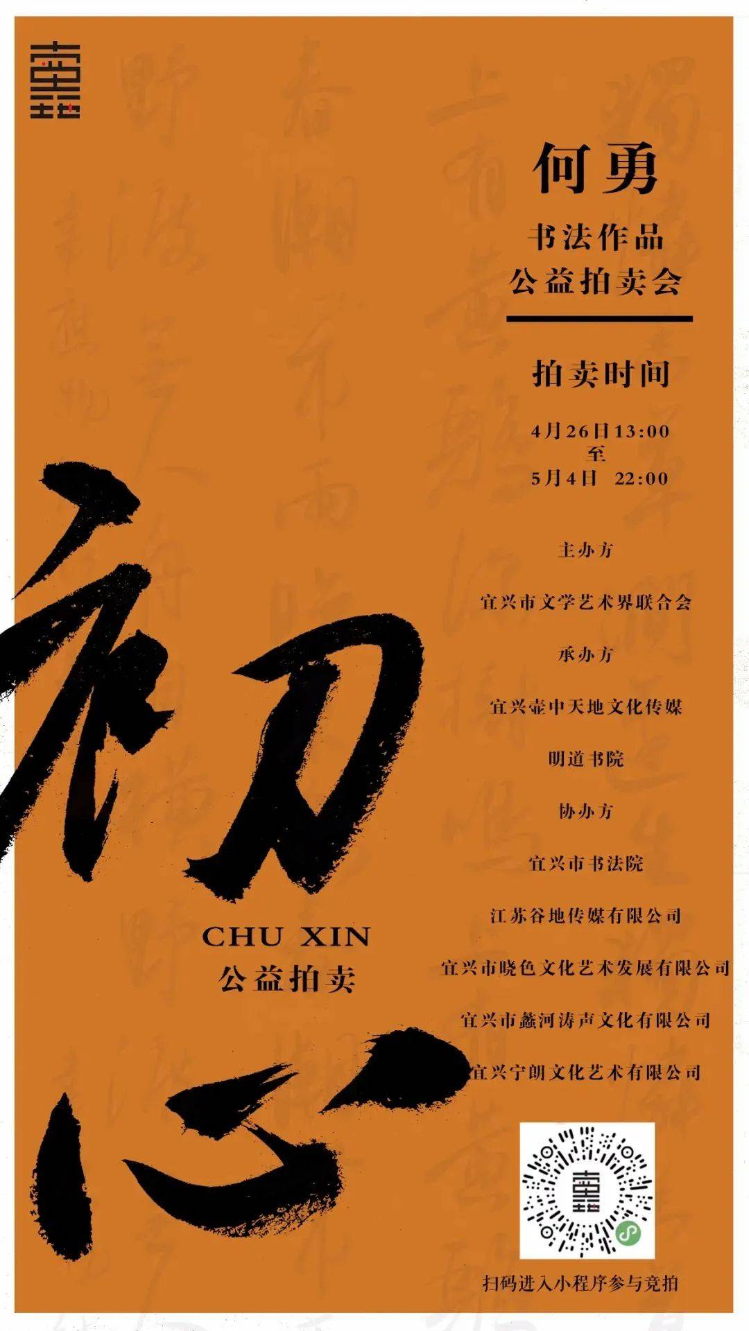 据悉,此次公益拍卖会由宜兴市文学艺术界联合会主办,宜兴市壶中天地文化传媒、明道书院承办,宜兴市书法院、江苏谷地传媒有限公司、宜兴市晓色文化艺术发展有限公司、宜兴市蠡河涛声文化有限公司、宜兴市宁朗文化艺术有限公司协办。 目前,公益拍卖作品已上线网上预展,拍卖时间为4月26日13:00至5月4日22:00,微信搜索小程序“壶中天地拍卖”可参与竞拍。 39件艺术精品,将为抗击疫情增添温暖色彩!再次奉献文艺力量! 何勇部分拍卖作品欣赏