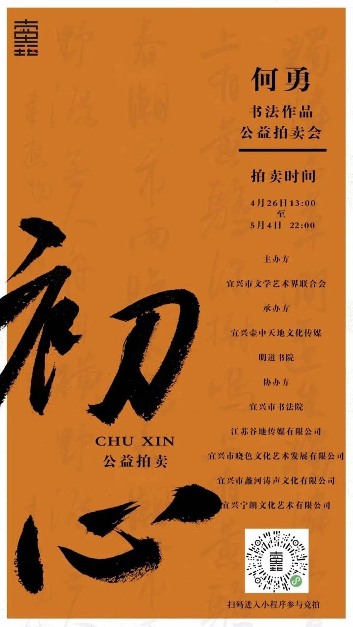 不变的是初心,永恒的是爱心 。疫情面前,众志成城。社会各界齐心协力,捐款捐物,共同抗疫。宜兴市文联副主席、无锡市书协副主席何勇坚信,书法家不仅需要有艺术上的追求,也要体现在社会上的价值,回馈于社会。 为此,何勇捐出自己的39件书法、紫砂作品,用于支持开展【初心】何勇书法公益拍卖会,拍得的善款将将全部捐助于宜兴市红十字会,用于抗疫专项基金。 据悉,此次拍卖会由宜兴市文学艺术界联合会主办,宜兴市壶中天地文化传媒、明道书院承办,宜兴市书法院、江苏谷地传媒有限公司、宜兴市晓色文化艺术发展有限公司、宜兴市蠡河涛声文化有限公司、宜兴市宁朗文化艺术有限公司协办。