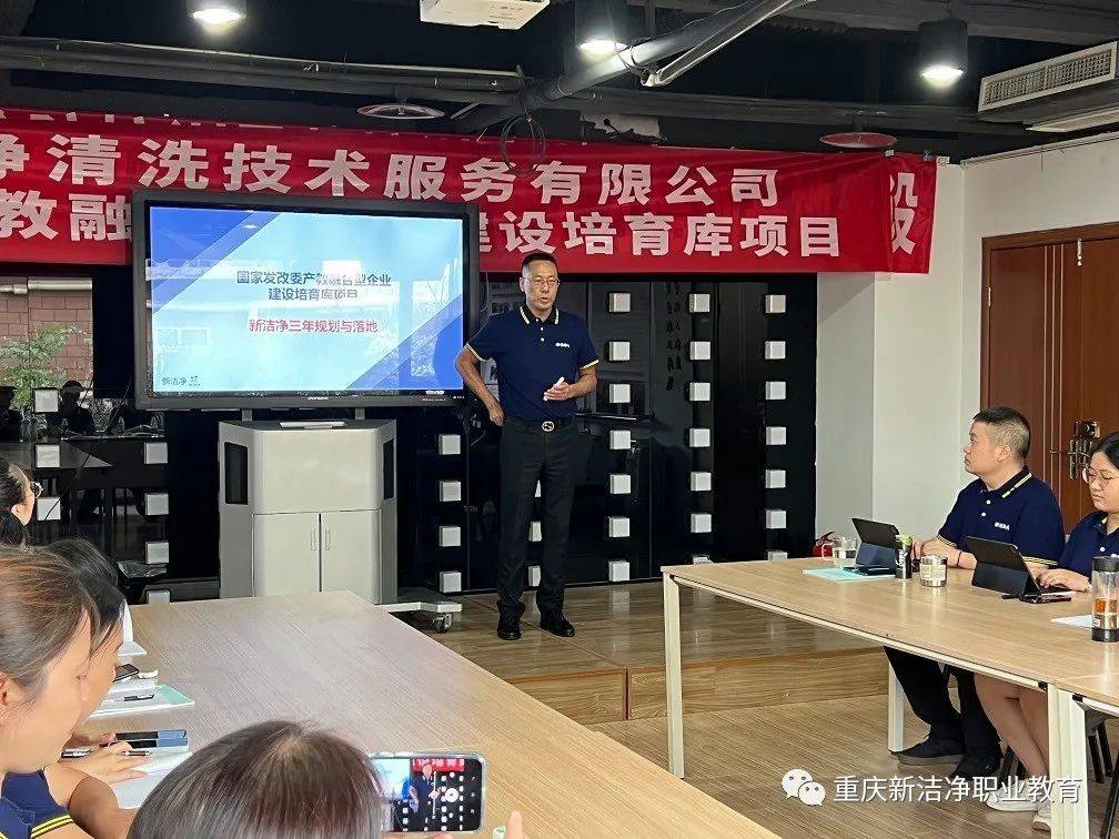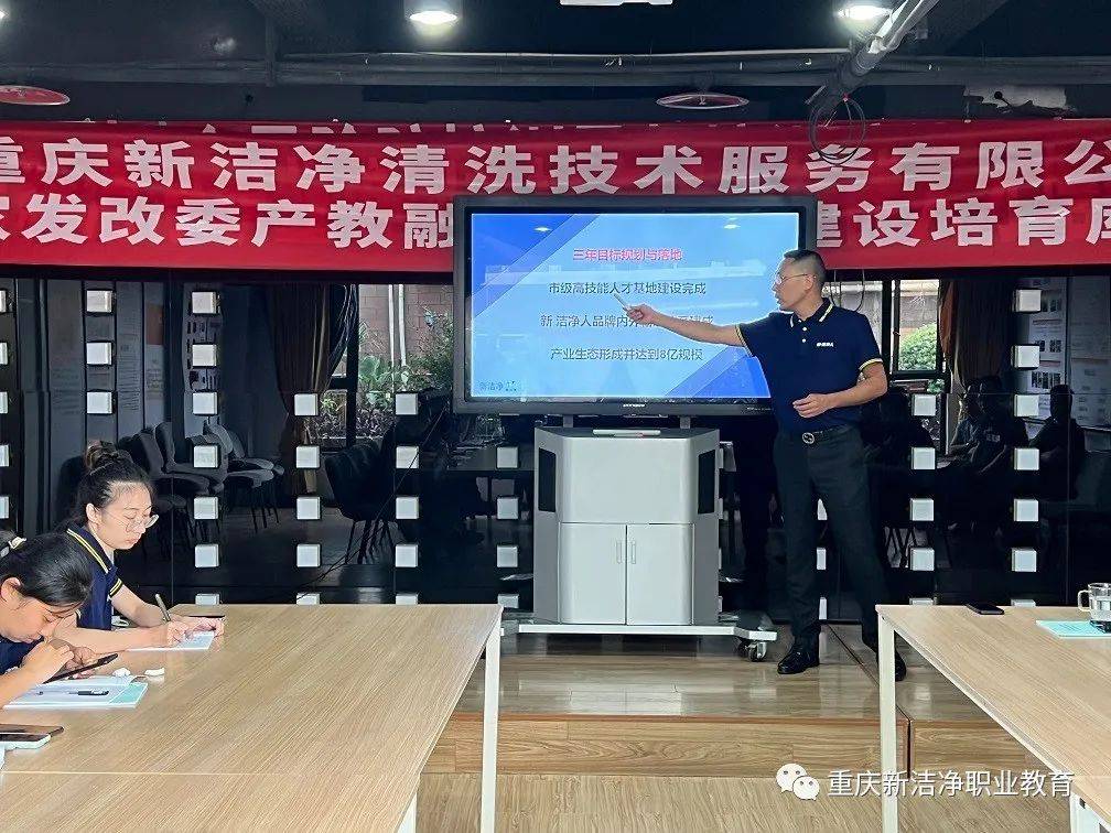 同时,新洁净公司下属重庆市新洁净职业培训学校还是重庆市市级高技能人才培训基地。结合这一优势,魏欣提出了新洁净公司产教融合项目未来三年规划:市级高技能人才基地建设完成、“新·洁净人”品牌内外输送体系建成、产业生态形成并达到10亿规模。