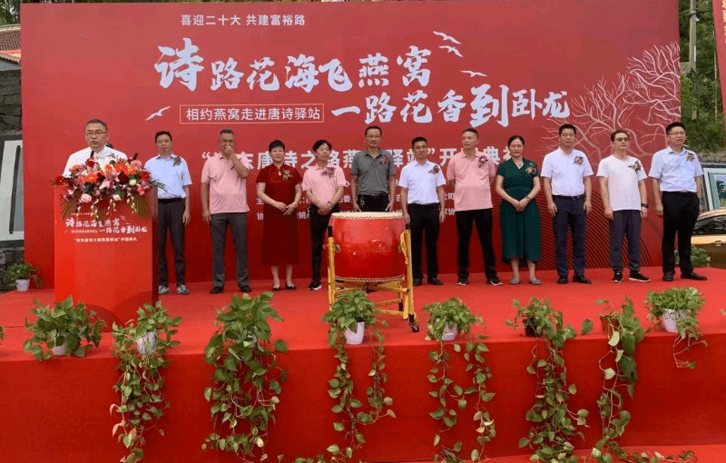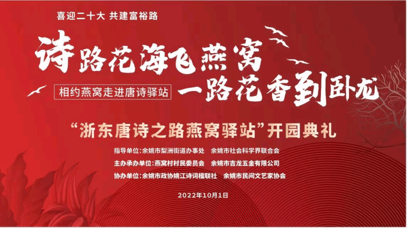 诗路花海飞燕窝,一路花香到卧龙。浙东唐诗之路燕窝位于四明山梁辉水库高山岭顶,是一个山高林茂的红色、绿色、古色的美丽山乡,由十八个山区小村聚落成村,这里既有唐诗神韵的诗风,留下唐朝陆龟蒙、皮日休等诗人的诗歌编入《全唐诗》书籍,驿站和村落民居所有墙头,以“一诗一画”反映当年诗路和旅人,一路翻越高山、岭岗、走燕窝古道游学赴明州、天台、舟山的唐诗;这里也是一个当年抗战和解放战争高举革命火炬的红色战场,驿站诗路一座“革命烈士陵园”长眠着这里十八位革命英烈,留下抗战时期“请君喝杯四明茶”等多篇浙东四明山革命红色歌谣的诞生地。启动仪式中,当地街道、村民群众代表、市有关部门人员和承办单位余姚市吉龙五金有限公司,以余姚市政协姚江诗社常务副社长张志中的“紫气东来秋送爽,唐诗驿站驻燕窝”现场赋诗达到高潮,韩连岳、费若君、黄建立等代表击响诗路大鼓鼓号,响彻岗岭山川。诗歌鼓声、咏诗好声音带领观众领略四明山梨洲山水,探访燕窝卧龙岗、石门岗、燕窝三十里古道,触摸梨洲街道高山沿途美丽乡村的历史、文化、绿色农林基地的脉搏。