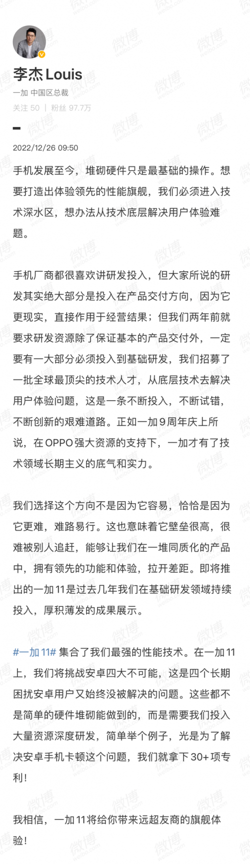 更多关于一加11如何挑战安卓四大不可能的最新信息,可关注一加官网、一加手机官方微博等官方资讯平台。2023年1月4日,一加将正式发布年度旗舰一加 11,为用户带来极致流畅一部到位的全新性能体验,敬请期待。 |