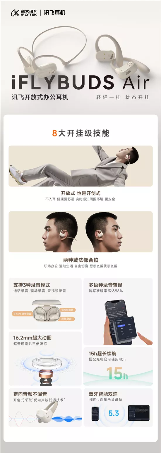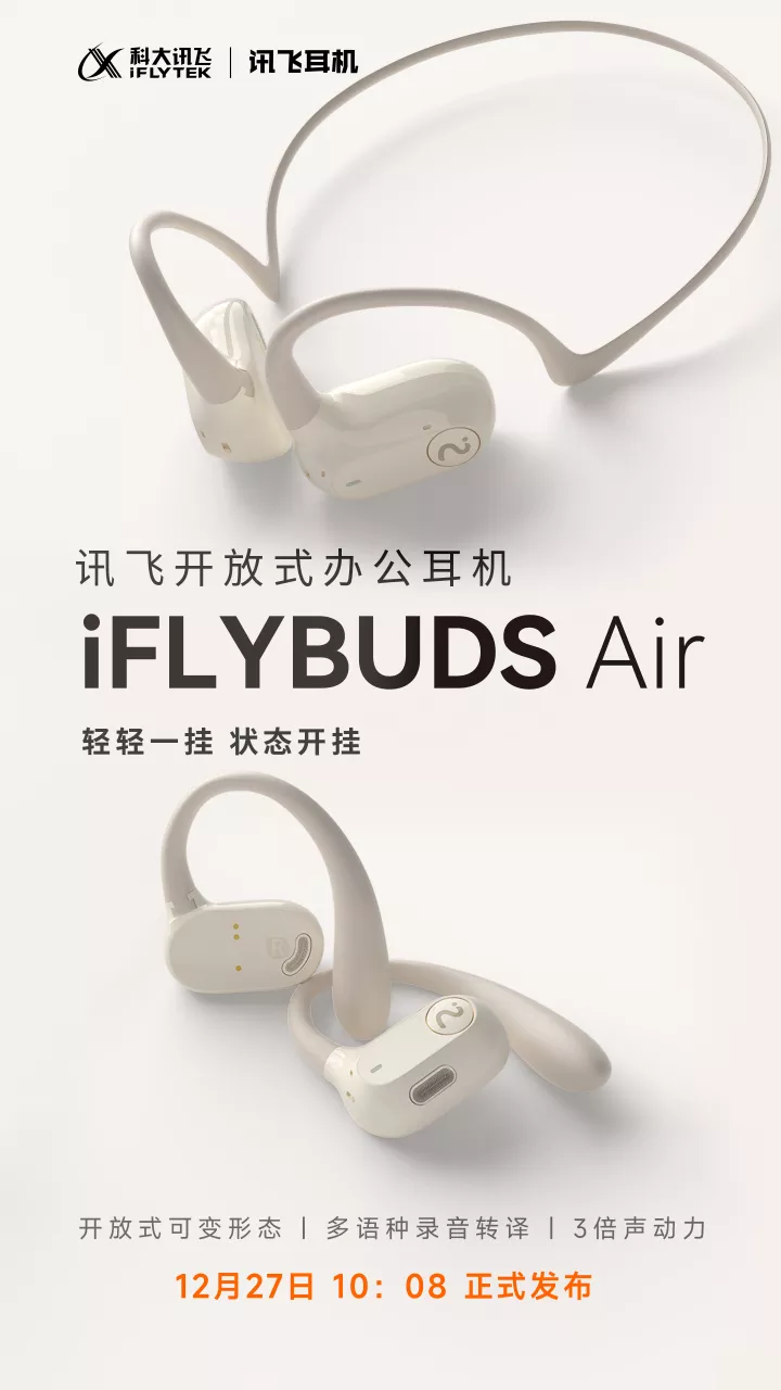 12月27日,由科大讯飞孵化的人工智能硬件公司--未来智能正式发布全新开放式办公耳机iFLYBUDS Air和未来智能会议狗两款新品。讯飞开放式办公耳机iFLYBUDS Air承袭iFLYBUDS系列办公耳机的核心AI功能,具有开放式不入耳、形态可变、实时录音转写转译三大特点,能兼顾办公、通勤及运动等场景需求,适合因工作和生活需要长时间佩戴耳机开会、打电话,喜欢听歌及户外运动的的职场办公人群。未来智能会议狗,专为高效桌面会议而生,搭配iFLYBUDS全系列耳机使用,就可以直接在PC端完成会议及音视频录音实时转写转译和修订分享,不再需要通过手机进行中转,进一步提升桌面办公效率。 ![]() 未来智能CEO马啸在产品发布公开信中说:“让世界万事万物的交互可以在AI的帮助下,更简单直观。我们无需在重复而繁杂的事务上浪费时间,可以更专注于热爱的事情,真正让我们生命的每一分钟都在体验生活,享受当下。”这是讯飞开放式办公耳机iFLYBUDS Air和未来智能会议狗两款新品生而肩负的意义。 ![]() 双形态设计,兼顾更多使用场景 讯飞办公耳机iFLYBUDS Air,解决了传统入耳式耳机的佩戴痛点,采用了全新开放式声学方案和创新性的可变形态佩戴设计,实现了不入耳不累耳不伤耳,长期佩戴保持耳朵舒适,兼顾职场办公与生活运动,适用更多场景。 ![]() 讯飞办公耳机iFLYBUDS Air拥有颈挂式和TWS耳挂式两种形态,一机多用,用户可根据实际需要自由切换,满足更多场景需求。颈挂式采用多点位均衡受力,配合人体工学记忆钛合钢丝耳机支架,适合日常办公使用。TWS耳挂式,轻巧便携,更贴耳,稳定性更强,高强度运动或日常通勤都能轻松应对。 ![]() 讯飞办公耳机iFLYBUDS Air采用了定向音频技术,通过空气定向震动传音,相比同样采用开放式设计的骨传导耳机,完美解决了骨压感、震感大的问题,减小耳机对听小骨的刺激。同时,采取“反向声波抵消技术”,实现了智能声波抵消功能,防止耳机漏音,舒适社交距离内享受音乐及通话等不怕被听到。此外,耳机还拥有16.2mm超大直径的喇叭,是普通耳机动圈单元的3倍,采用了日本大黑原厂铜线绕制的无管音圈和高性能铷铁錋磁铁等高端材料,让三频均衡响应灵敏,中高音通透低音浑厚,可以更好地还原真实音质。 ![]() 录音及实时转写,日常办公生产力标配 讯飞办公耳机iFLYBUDS Air承袭iFLYBUDS系列办公耳机的核心AI功能,支持通话录音、音视频录音、现场录音三种模式,可轻松满足日常办公会议场景需要。对于经常进行电话会议的白领人群,在这款专业办公耳机的辅助下,无需在重复而繁杂的事务上浪费时间,大幅提升了工作效率,解放双手。 同时,讯飞办公耳机iFLYBUDS Air还针对通话和面对面的录音记录和转文字功能,升级为双通道,上下行可以独立录音,让耳机使用者和其他参会人的天然区分,能更有效的区分其他参会人,还提升语音识别率,让录音记录的整体可读性进一步提升。 针对日常面对面沟通、小型会议等现场录音场景,讯飞办公耳机iFLYBUDS Air的拾音覆盖最高可达7m。还支持包括中英日韩俄法等9种语言,河南话、河北话、四川话、云南话、粤语等12种中文方言,金融、法律、科技、医疗、教育、等10大行业领域专业术语翻译转写,实时录音转写文字,准确率可达到98%以上。 ![]() 卓越产品硬件设计及配置,操控更便捷 讯飞办公耳机iFLYBUDS Air的外观设计采用简约时尚风格,砂岩白外观配色,富有科技感,适合在办公、商务及运动等场景使用。耳机机身采用轻量化设计,TWS模式下单只耳机仅重11.5g,颈挂模式下整体耳机仅重23.5g,不会觉得累赘。 续航方面,讯飞办公耳机iFLYBUDS Air单次充满电,支持音乐15小时,通话12小时通话,录音转写7小时,全天不断电。搭配充电盒使用,支持40小时音乐,相比同类气传导或骨传导耳机,续航大幅领先。 此外,讯飞办公耳机iFLYBUDS Air还拥有搭载AI通话降噪算法,利用强大的深度神经网络算法,即使在非稳态噪声场景下,也能带来较好的语音通话体验。耳机蓝牙版本为5.3,支持同时连接两个设备,双设备切换智能便捷。操控也同样非常智能,可在 App 内进行触控功能操作自定义设置,贴近用户个人使用习惯。 ![]() 这一次,未来智能还同时发布了创新产品未来智能会议狗,搭配iFLYBUDS全系列耳机使用,就可以直接在电脑上完成会议所需要的所有录音、记录、转文字、修订分享,不再需要通过手机进行中转,进一步提升桌面办公效率。未来智能会议狗是iFLYBUDS系列办公耳机的天生搭档,提高桌面办公效率。 ![]() (一张图读懂) |