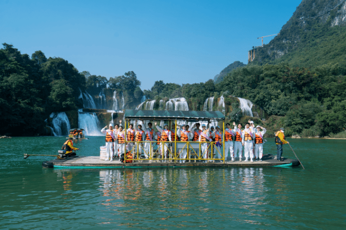 参赛选手们出发首站·德天瀑布,德天跨国瀑布景区位于崇左市大新县,被评为中国最美的六大瀑布之一,展现了东盟风、边关韵、中越情的魅力。
