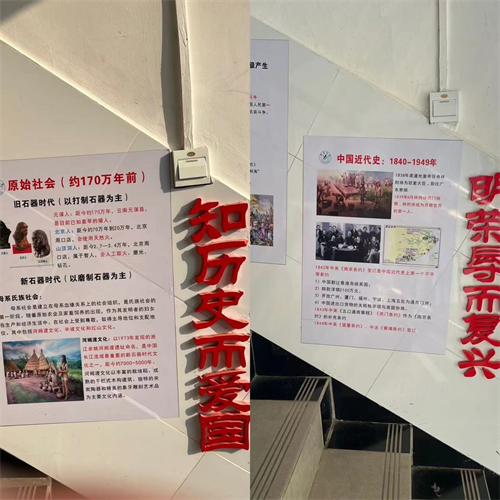 打造历史文化长廊为了引导学生了解国情,营造爱国氛围,增强民族自豪感,许市镇逸夫小学以校园文化为抓手,在教学楼的楼梯旁打造了一条历史文化长廊。“知历史而爱国,明荣辱而复兴”这是徐校长主张张贴历史文化长廊的初衷,也是逸夫小学开展爱国教育的体现。