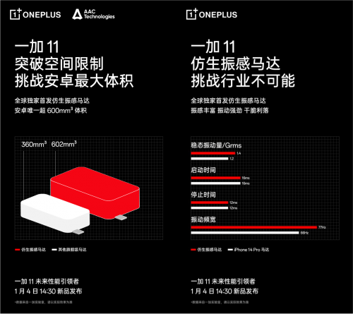 早在2019年,一加便与瑞声科技联合为一加 7 Pro定制当时安卓手机里尺寸最大、性能最强、响应最快的横向线性马达,刷新用户对安卓马达的认知。此后一加历代性能旗舰均搭载行业领先马达。顶级马达体验已融入一加的性能基因,此次独家搭载仿生振感马达的一加 11 将成为手机马达新标杆。