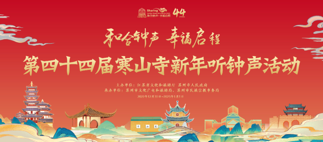由江苏省文化和旅游厅、苏州市人民政府主办的第四十四届寒山寺听钟声活动将于12月31日举办,本届听钟声活动,以“和合钟声·幸福启程”为主题,围绕和合文化、江南文化、运河旅游等元素,区别于前2年,本届听钟声活动,重启线下形式,通过线上线下联动的动作,带来欢乐祥和的新年氛围。
