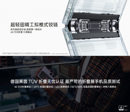此外,OPPO Find N2 Flip采用了超轻固精工拟椎式铰链,保持机身轻量化的同时,也成为了首款通过莱茵折叠无忧认证的竖向折叠屏手机,实现40万次折叠依然保持久用稳定的优异表现,真正告别“翻折焦虑”。