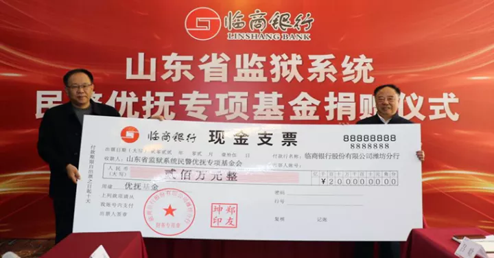 ![]() 2022年2月14日,临商银行与邮储银行山东省分行全面合作暨数字人民币战略合作协议签订仪式举行,临商银行党委书记汲长虹出席会议并致辞。邮储银行山东省分行党委委员、副行长张文,临商银行党委副书记、行长周曙光分别代表双方签署了全面合作暨数字人民币战略合作协议,为临沂经济社会高质量发展提供坚实金融保障。 5.临商银行向山东省监狱系统民警优抚专项基金捐赠200万元