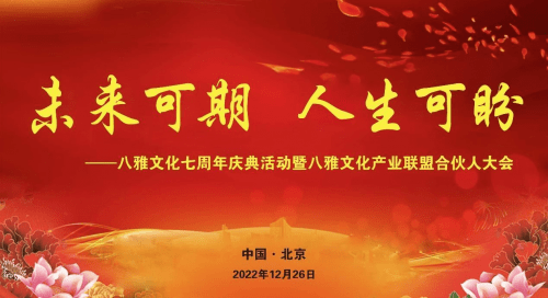 “未来可期,人生可盼”——八雅文化七周年庆典活动暨八雅文化产业联盟合伙人大会于2022年12月26日17:28——21:58在北京盛世开元宴会厅举办,活动由传统文化爱好者、八雅文化产业联盟副秘书长关洪刚先生主持。 出席的领导,嘉宾有:人民艺术家网主编初科汝先生,著名词曲作家孙义勇先生,著名音乐人、北京第柒传媒文化传播有限公司董事长翟刘斌先生,著名诗人、中诗协创始人黄莽先生,新疆名诺酒厂董事长姚静女士,中国旅游文化网主编周步先生,中国传记文学学会理事陈家忠先生,著名歌手、人民音乐出版社《中国民歌少儿唱》主编温楠先生,北京中艺联合美术院行政院长张博先生,北京平安居家房地产经纪有限公司顾问陈刚先生,北京平安居家房地产经纪有限公司总经理孙中亚先生,传统文化传播者、八雅文化产业联盟副秘书长关洪刚先生,摄影爱好者、丹纳赫颇尔PALL公司产品设计开发工程师侯建润先生,北京建工四建工程建设有限公司崔长波先生,新疆名诺酒厂北京办事处孙晓光先生,中国书法家协会会员杨刚亮先生,北京陌上虚健康产业管理有限公司总经理王友辉先生,北京大唐世纪展览展示有限公司总经理唐立娜女士,中国管理科学研究院福彩生活研发中心副主任白宏伟先生,北京首喜餐饮管理有限公司董事长刘鹏先生,北京辉煌九鼎知识产权咨询服务有限公司总经理李秋来先生,北京心愿传承养老服务中心主任孔凡硕先生,袋鼠葡萄酒销售(北京)有限责任公司总经理王张凯先生,北京中经决策鑫国研经济咨询中心经理马宇光先生,中国国际书画艺术研究会中艺联合美术院理事、北京律师书画院会员任旭丰先生,八雅文化产业联盟副秘书长高超先生,八雅文化创始人、八雅文化网主编、八雅文化产业联盟主席、中国八雅文化春节联欢晚会发起人,总策划兼总导演八雅先生刘永国等。