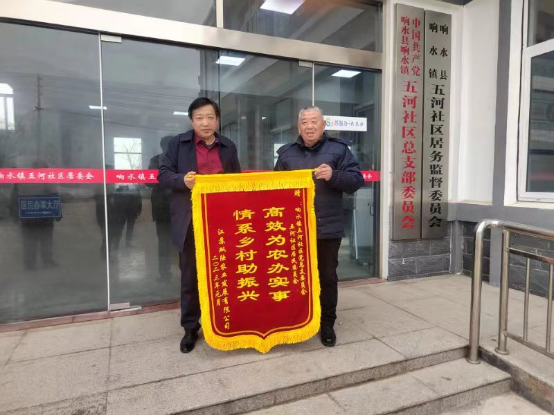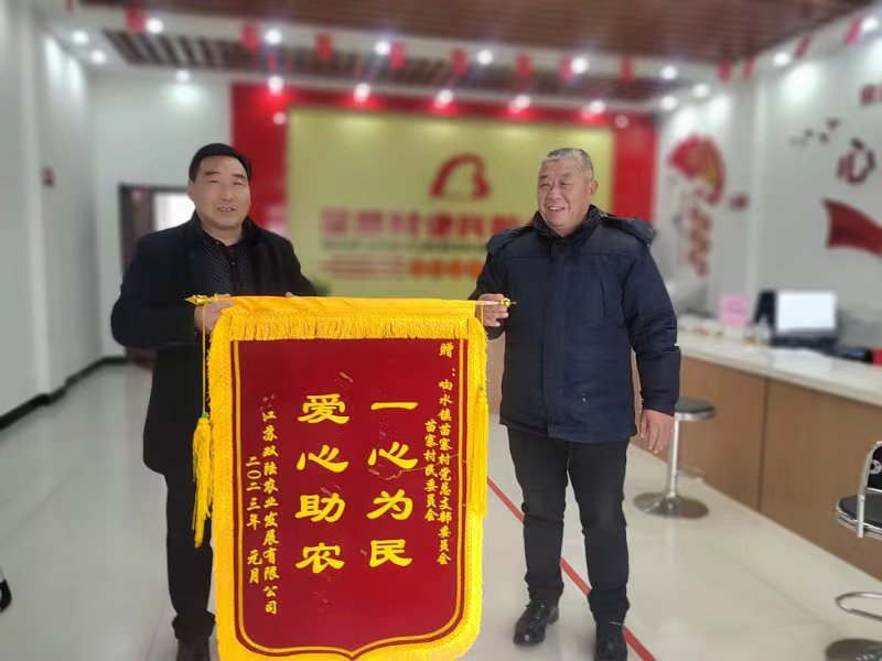 1月12日下午,江苏双陆农业发展有限公司副总经理董飞一行,先后将精心制作的大红锦旗送到了响水县响水镇苗寨、五河、上兴、潘庄等四个村居党总支部,对他们热心服务生态农业发展,助力乡村振兴,积极履责、担当作为,排忧解难、精准服务的做法表示感谢。