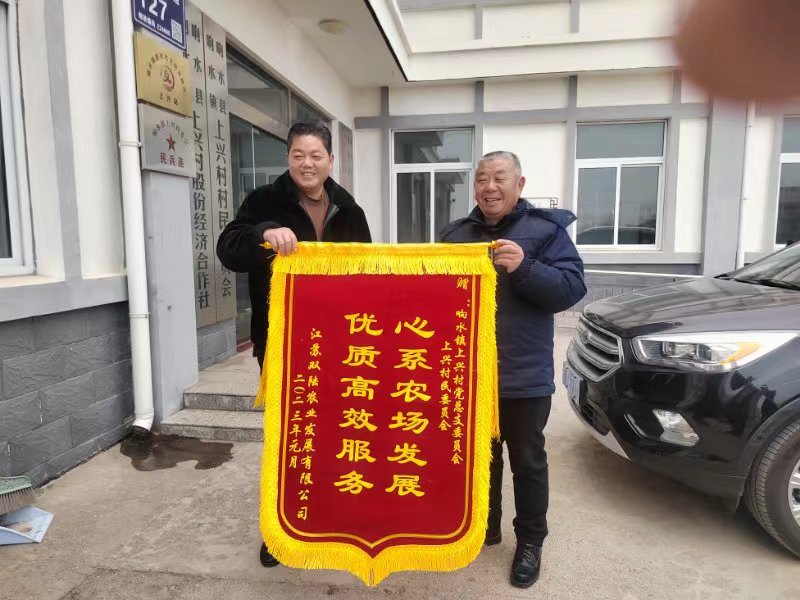 去年,江苏双陆农业发展有限公司在响水镇西片,集中承包五河、苗寨、上兴、潘庄四个村居12000多亩土地规模种植,得到了当地村居干部的大力支持和热心帮助。公司与百姓地界发生矛盾时,村干部主动到田头解决;农忙季节,公司急需用工200多人,村居干部挨门逐户动员,为企业解决了用工难题。去年汛期时天降大雨,江苏双陆农业发展有限公司承包潘庄村5组的400多亩高粱泡在水里,受涝严重,村党总支书记王其连夜安排挖掘机帮助公司疏通排水渠道,很快排清了积水,保证了粮食丰产丰收。年终岁尾,江苏双陆农业发展有限公司将一面写着“高效为农办实事,情系乡村助振兴”的锦旗,送到了潘庄村党总支书记王其的手中,表示由衷的谢意。