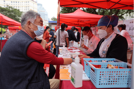 广西医大开元埌东医院设置了健康咨询区,十几个科室的专家、主任、资深护师与市民面对面,开展健康咨询。在儿科咨询台前,围满了家长和孩子,孩子们玩玩具,家长向医生咨询孩子的营养、专注力等问题。在妇科咨询台,女士们了解盆底肌康复等女性健康知识。市民还获得了免费进行人体成分分析的机会,广西医大开元埌东医院的护士请市民站在人体成分分析仪上进行测试,使市民对自己的体脂百分比、内脏脂肪、骨骼肌等有了解,从而进行科学减脂减重,远离高血压、高血脂、高血糖这“三高”。