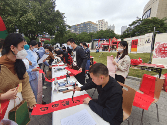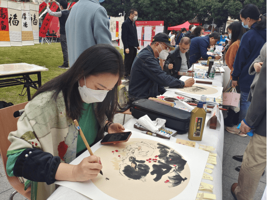 文艺爱好者们在舞台上表演着精彩的歌舞节目,书画家们现场挥毫泼墨写春联、画年画、剪窗花,免费赠送给居民们。南宁市美术家协会理事零雅婷画的水墨画《双兔呈祥》很受居民的欢迎,大家排着队等着请祥兔回家。零雅婷手执毛笔,聚精会神地画着,3小时里几乎没停笔,只为满足大家的需求。