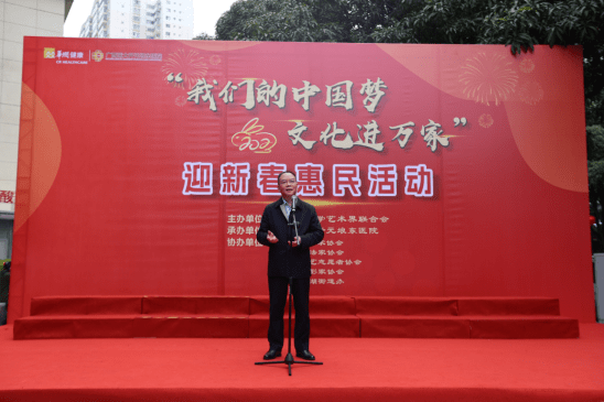 广西书法家协会副主席、南宁市书法家协会主席潘继坦在致辞中表示,在三年抗击新冠疫情中,广大白衣天使迎难而上,舍生忘死,为人民群众的身体健康筑起了坚强的堡垒,创造了伟大的抗疫精神。文联一直以来都致力于优秀文化的传播与传承,在疫情封控期间,为丰富人民群众的精神文化生活不遗余力。身体健康,精神愉悦,是广大百姓追求美好生活的殷切期盼。在农历兔年春节即将来临之际,广西和南宁的广大艺术工作者深入到社区,深入到企事业单位一线,与医务工作者、与社区居民一起欢度佳节、把手言欢,我们倍感荣幸,倍加欣慰。