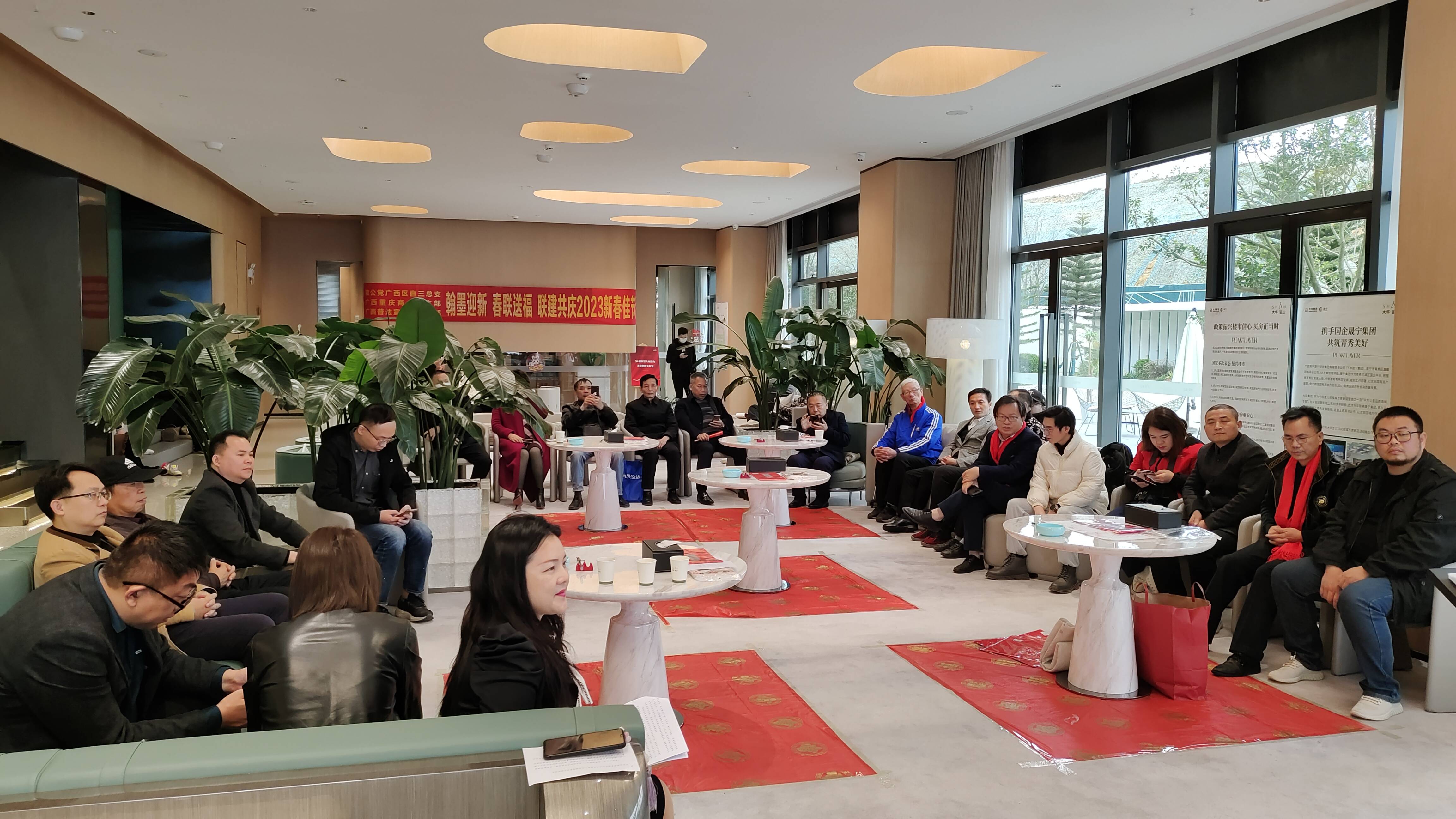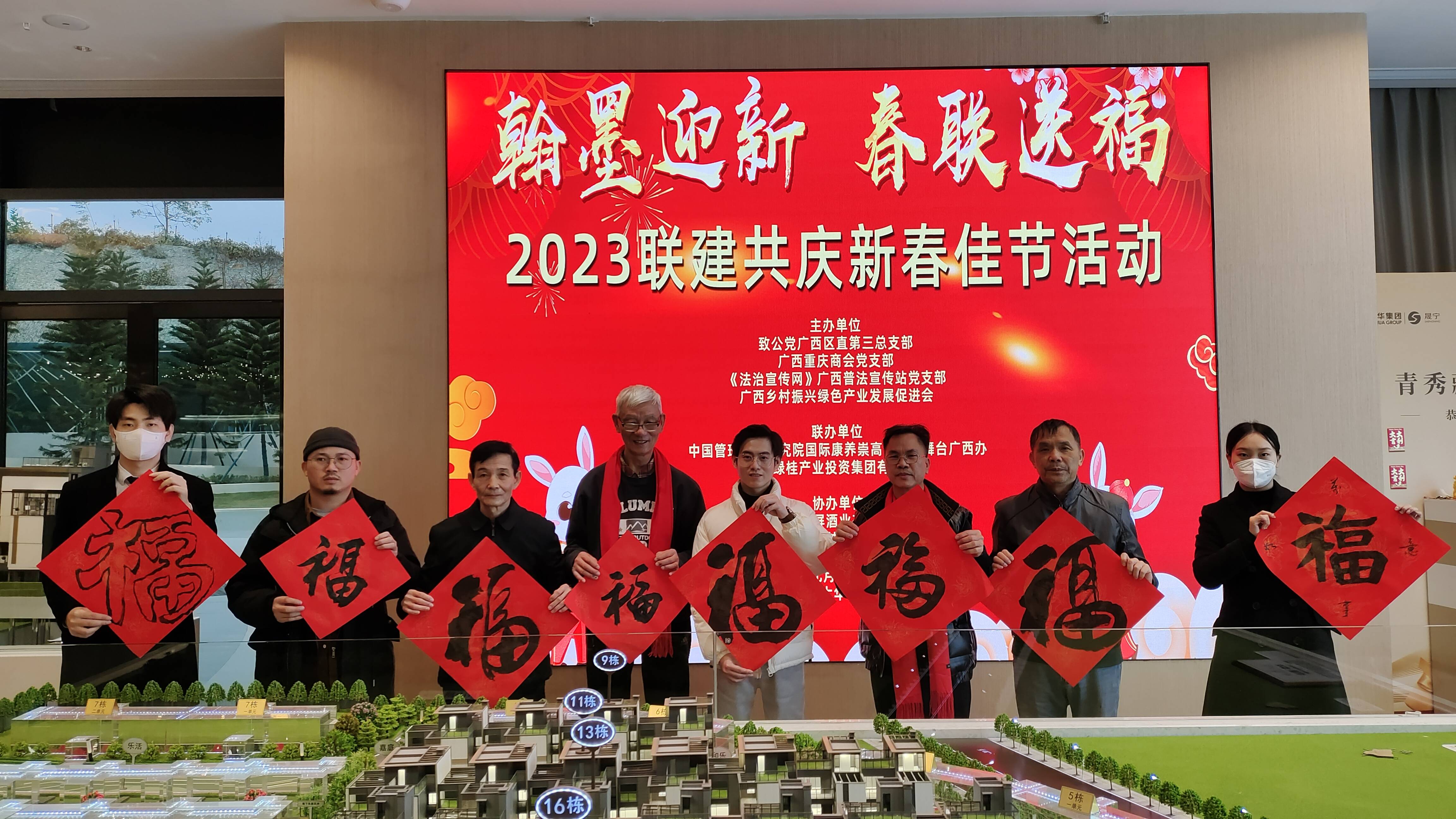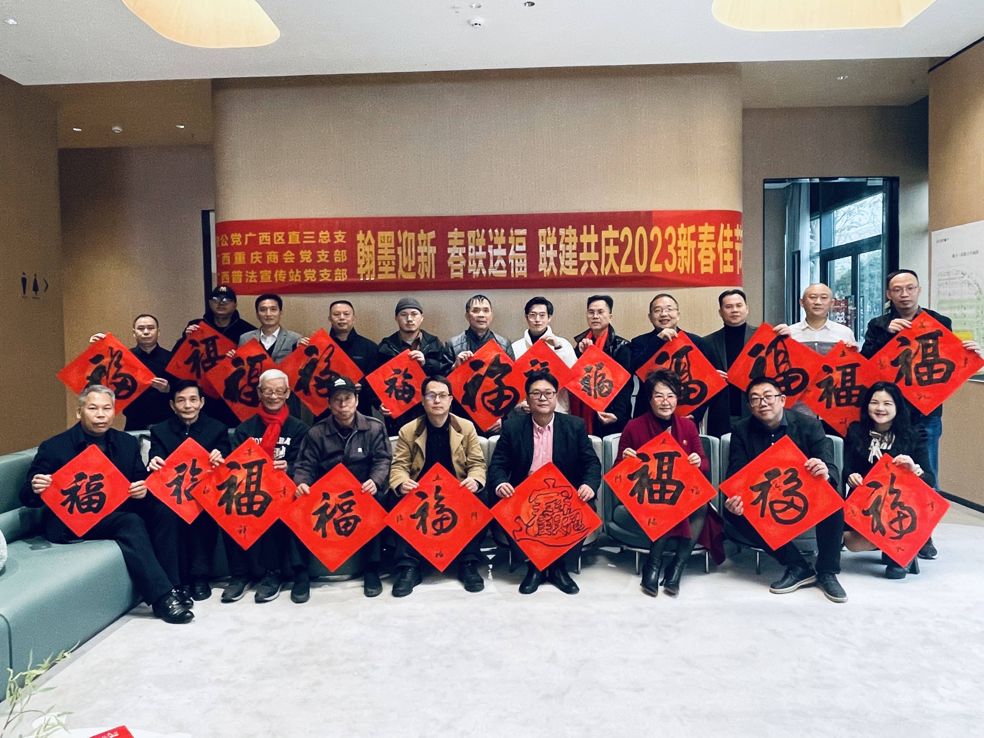 虎啸丛林增瑞气,兔驰沃野益新风。1月15日,在2023年中国传统的春节即将到来之际,《法治宣传网》广西普法宣传站党支部联合致公党广西区直三总支、广西重庆商会党支部、广西乡村振兴绿色产业发展促进会、广西翠屏酒业有限公司共同举办“翰墨迎新,春联送福”联建共庆新春佳节活动。