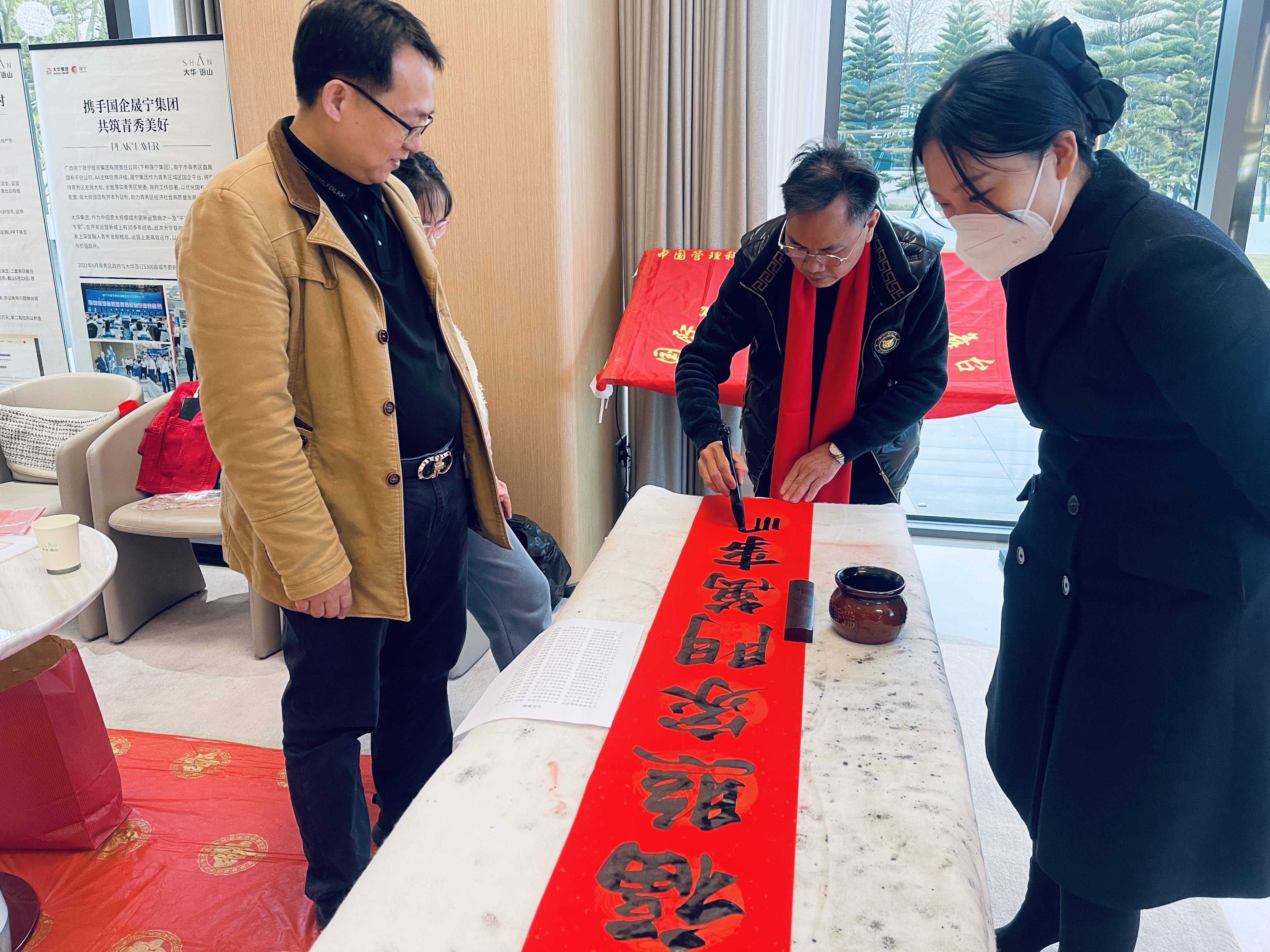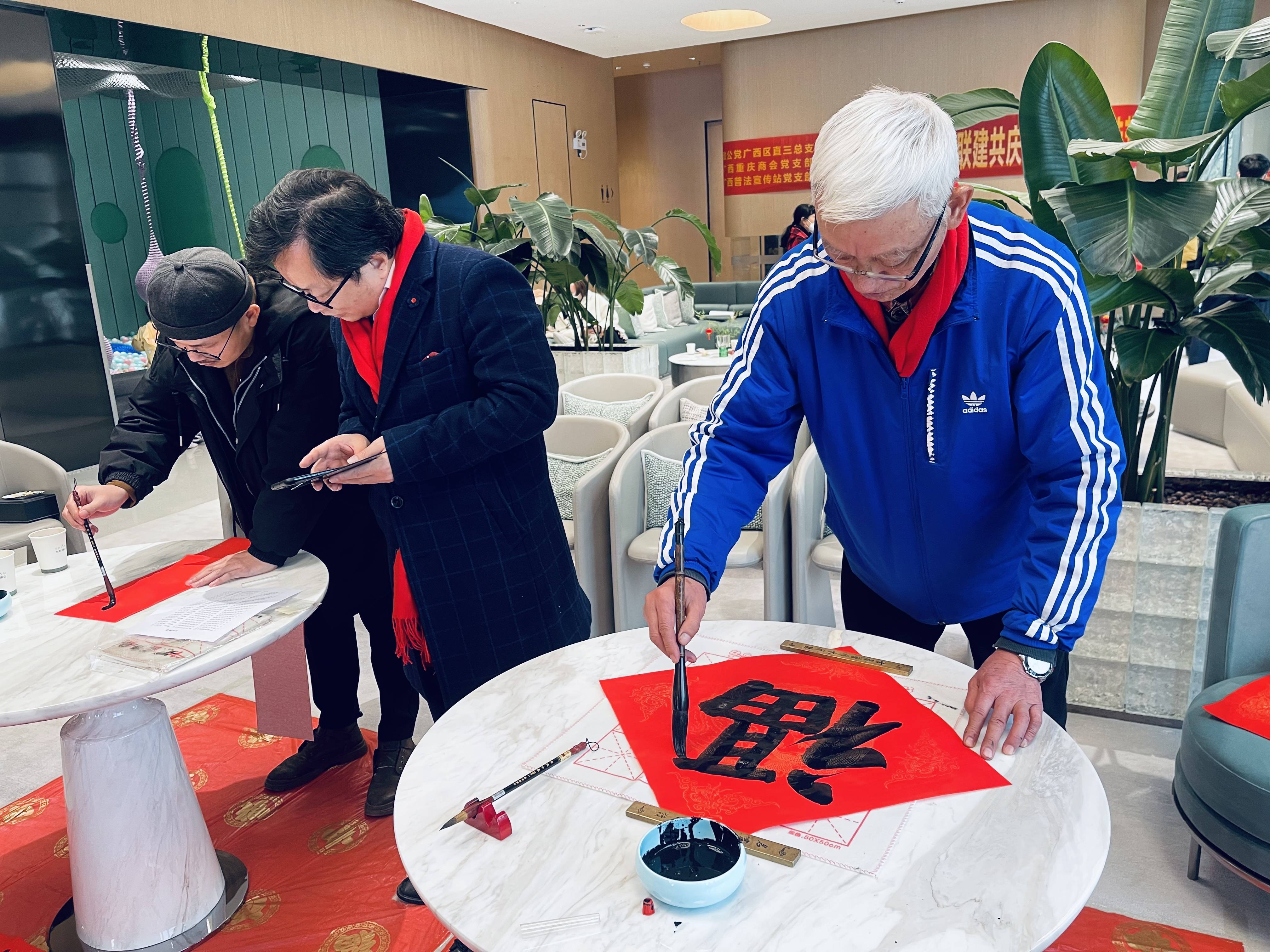 广西区书法家协会、广西区直机关书法家协会、广西老年书画研究院书法协会会员、桂林漓江印社常务副社长竺学勋,广西著名篆刻家、书法家黄远,广西书法协会会员、四川省文化艺术学院、广西艺术学院特聘教师王浩先,《法治宣传网》广西普法宣传站站长、资深媒体导演、一级书法讲师江怀章,南宁市书法家协会会员、广西书法教育学会理事农海云五位书法家个个精神抖擞,运笔如风,尽情挥毫泼墨。红彤彤的春联和福字纸上,行书、楷书、隶书等字体各显神韵,墨香飘溢。一行行俊逸的书法,一句句火红的祝福,洋溢着浓浓的节日喜庆气氛,为新春带来了别样的温暖。