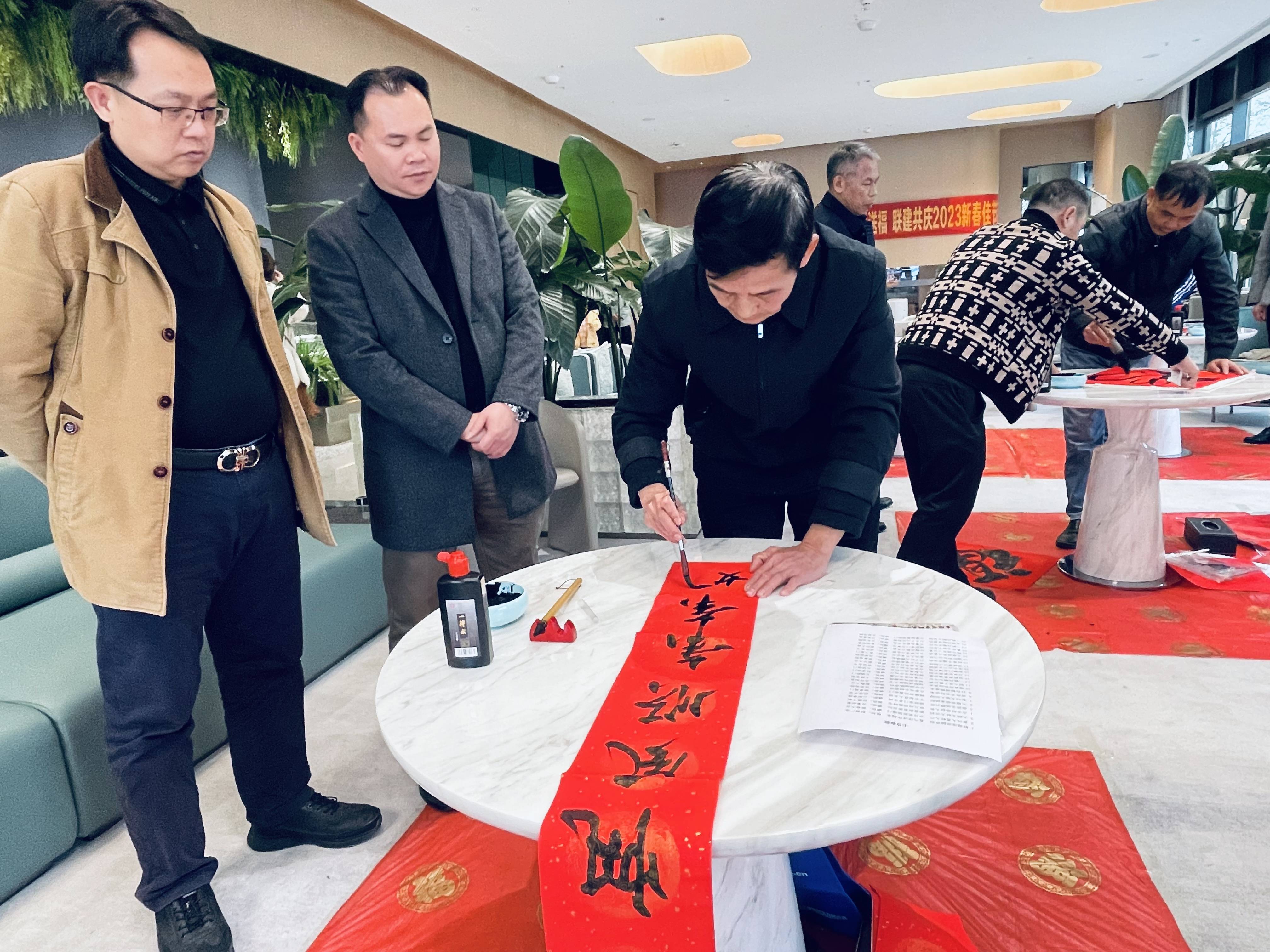 墨香深情迎福兔,春联寄语送安康。写春联、贴福字、贴窗花是我国春节的传统习俗,象征着美好、吉祥、如意和好运,表达着人民对幸福生活的向往。此次活动特别邀请了广西著名书法家现场挥毫泼墨快意书写春联和福字,赠送给与会40嘉宾、党员和家属。