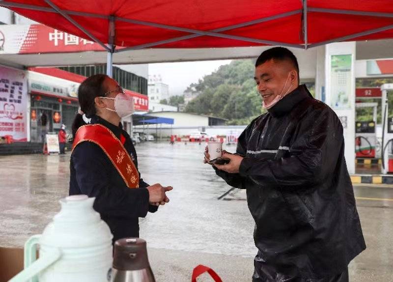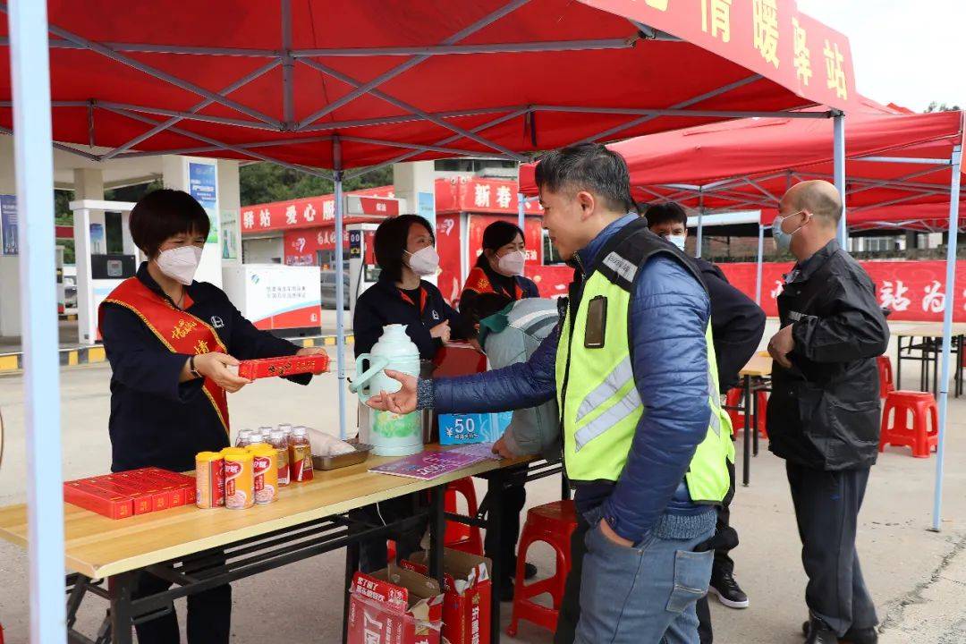 06:00 姜茶热气腾腾,等候归家人 “每年春节前,我都会选择骑摩托车回家过年,今年是第5年了。无论是风和日丽,还是刮风下雨,这里总会有热情的志愿者,暖身又暖心的姜茶在等着我们。每年到这里休息一下已经成为了习惯,不知不觉就把这里当成了返乡路上的一个小家……”在江门务工的宾胜石,讲述了自己与中国石化情暖驿站的故事。 2004年开始,中国石化广西石油从一杯姜茶开始,不断地磨合和改善服务项目,持续为摩骑返乡这个群体提供关爱和帮助。服务项目从“6+X”逐步升级到“1+10+X+1”,从一杯姜茶,到应急药品、热饮、手机充电、简易维修、针线包、道路指引,再延伸到赠送方便面、热水杯、手套、围巾、书包、福袋、大礼包等各项暖心服务;从几张桌椅,到专门设置绿色加油通道、保暖休息室、爱心母婴室、心理咨询室、劳模服务队等。近年来,新冠疫情反复,广西石油结合目前我国疫情防控新形势新阶段,新增了防疫安全服务,在都连驿站现场准备了免洗消毒液和一次性口罩,免费提供给有需要的返乡人员。