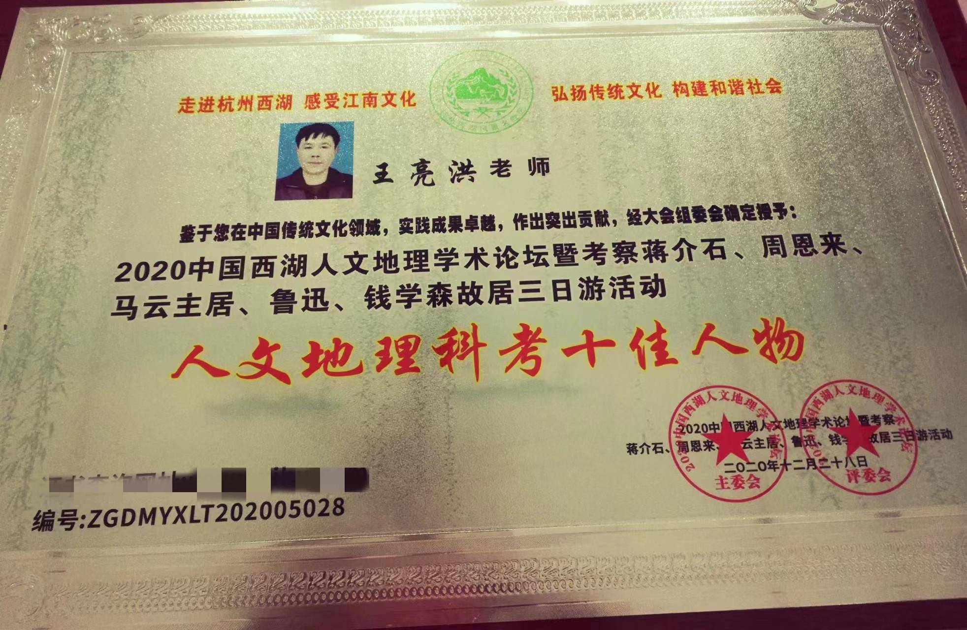 王亮洪:人文地理科考十佳人物 王亮洪:男,又名王晨源,他于1978年3月出生于贵州省江口县,幼承祖训,喜欢中国优秀传统文化,特别是至幼受祖父的影响对《易经》风水产生浓厚的兴趣,在祖父的影响指导下,认真研读《易经》、《道德经》、《撼龙经》、《推背图》等传统文化经典,迄今为至,以研究易经风水堪舆文化20余年,他平常主攻三合天星风水九天玄女派,对阴阳二宅堪舆策划,八字命理学分析应用,姓名学,数字能量学,手面相学研究应用也有很深的研究。多年来他读万卷书、行万里路,曾拜多位民间高师为师学习易道各派文化。走访天下名山大川,考察无数名人故居、社会贤达坟墓风水。鉴于他在易道文化应用方面取得的成绩,他多次应邀参加全国性易经大会,曾与当代多位知名易学文化人士共同研讨易经风水。他于2020年参加浙江易经论坛大会暨华夏名人故居堪舆风水科考大会,他担任了本次科考大会论坛副主席,并获得了全国人文地理科考十佳人物的荣誉称号。2021年被当代易学导师联盟协会、华夏易学联合会聘为常务理事兼学术专家组成员、中华传统文化创新发展论坛组委会副主席,华夏人文出版社高级国学研究员等殊荣。