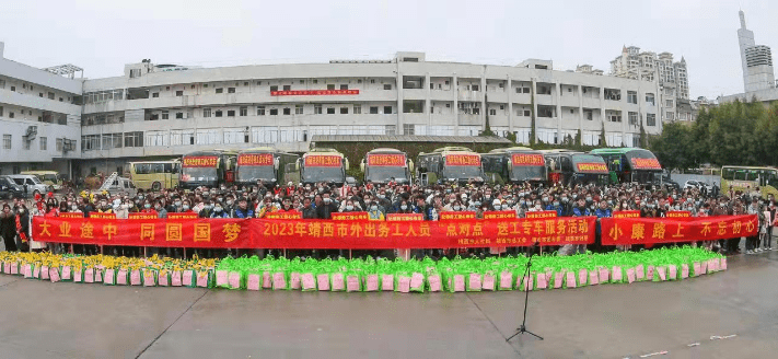 (图为:2023年靖西市“就业暖心•桂在行动”专项服务暨“点对点”送工服务免费乘车活动现场) 2月2日(正月十二)上午,2023年靖西市“就业暖心•桂在行动”专项服务暨“点对点”送工服务免费乘车活动正式启动。市政府领导出席活动并致辞,市人社局、市乡村振兴局、市交通运输局等相关部门领导及当天外出务工人员600多人参加启动仪式。上午11时许,搭载着560名务工人员的爱心专车从靖西开往广东,满怀希望地奔赴目的地,开启新年致富之旅。