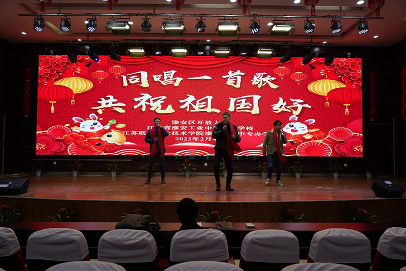 同唱一首歌,共祝祖国好。会议伊始,李明海、胡大明、秦坚等老师用歌声为大家送来新春祝福,校党总支书记、校长贾朝东带领15名老师深情同唱《相亲相爱一家人》感染全场,酵浓着校全体教职工的凝聚力。