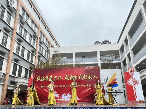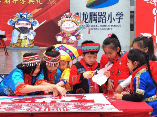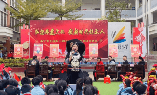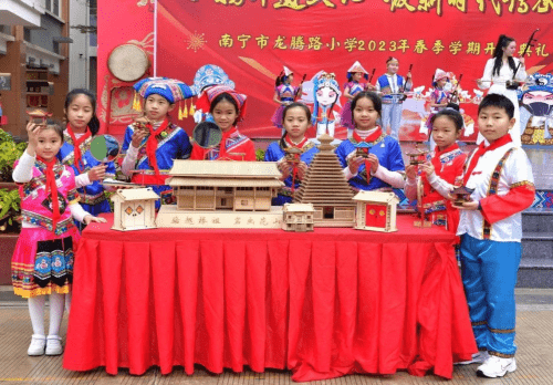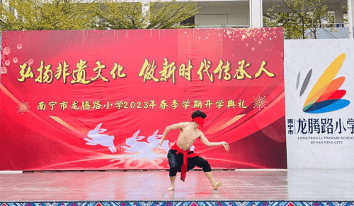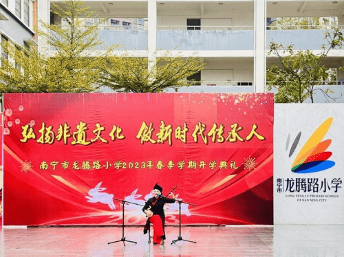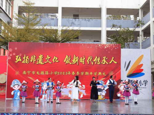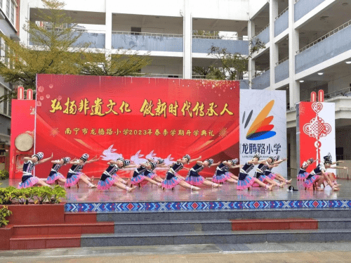 ——广西南宁市龙腾路小学2023年春季学期开学典礼 为更好地保护、传承非物质文化遗产,营造非遗保护传承的良好校园氛围,广西南宁市龙腾路小学开展主题为“弘扬非遗文化,做新时代传承人”的开学典礼。 2月6日上午8:00,过桥摸钉、摸龙头元宵节的“老礼数”在龙腾家族上演,这是寓意无灾无病,象征幸福安康的民俗活动,沉浸式的体验民俗文化,让师生深入了解元宵的民俗文化,感受中国传统文化的魅力。非物质文化遗产是中华民族历史长河里留下的瑰宝,凝聚了祖先们的智慧和精神,传承非遗文化是对非遗文化遗产保护的最好方法,让同学们接触非遗、学习非遗、热爱非遗、传承非遗,让存在博物馆里的“遗产”变成我们手上的“财产”。在开学典礼上,学校邀请了著名女高音歌唱家,国家一级演员,壮族歌后,广西文化名家暨“四个一批”人才、国家级非遗项目那坡民歌的自治区级传承人黄春艳老师;广西民族大学副教授、东盟青年艺术联合会主席团成员、中国少数民族舞蹈学会理事、广西舞蹈艺术学会副会长李飞锐教授;广西音乐家协会会员,龙州天琴女子弹唱组合第一批成员农雰岚老师;青年教师、编导,全国中小学艺术作品著名编导,中国音乐学院《中国民歌与戏曲》项目特邀专家,广西民间文艺家协会会员,广西少数民族传统体育表演项目基地负责人温智淞老师等嘉宾,他们为师生带来了民歌、民舞、民乐等非遗艺术表演,师生们被非遗艺术魅力深深打动,现场掀起多次高潮,掌声响彻整个校园。非遗文化进校园是传统文化自信的彰显,也是“润物细无声”的文化传承。