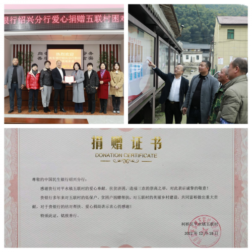 2月1日,中国民生银行绍兴分行党委书记、行长、工会主席专程到五联村,开展了“深化银村结对新共建 开展浙江有礼新实践 共绘美丽乡村新蓝图”的“我们的节日•元宵”主题活动。 绍兴平水山区五联村,春秋战国时期越王苟践卧薪尝胆、屯兵操练的名胜之地,中国民生银行绍兴分行“双千结对•共建文明”连续六年的“亲家”之村。 2月1日元宵节前夕,绍兴市越城区新时代文明实践点——中国民生银行绍兴分行志愿者,在党委书记、行长,工会主席的带领下专程到五联村,开展了一次“深化银村结对新共建 开展浙江有礼新实践 共绘美丽乡村新蓝图”的“我们的节日•元宵”主题活动,受到了村党总支书记、村委主任一行的热烈欢迎。 乘着兔年省、市“新春第一会”阵阵战鼓和暖暖春风,绍兴分行党委、工会俩位主要领导在2023年第一次结对共建活动中,祝福五联村的干部和村民新春快乐、阖家幸福,在美丽乡村共富建设中展现新气象、新发展,村会议室20余名参加座谈会的困难村民报以热烈的掌声,现场洋溢出一片喜庆、温馨的氛围。 党委书记、行长一行在村干部的陪同下,特意走访了文明家庭示范户代表徐传富,向他表示新春的祝贺和期望,到半山坡病人徐大伯家庭,向本人和家属表示亲切慰问,这次元宵节前夕走访慰问了27户村民,送上了共建单位的汤圆、牛奶、红枣、食用油等慰问品。至此己累计向结对村扶贫济困、扶残助残、礼遇先进等走访慰问109户(次)。在村文化礼堂,双方举行了颁证仪式,平水镇五联村委向民生银行绍兴分行颁发了《捐赠证书》,“感谢贵行的爱心奉献,扶贫济困,造福三农的祟高之举”“多年来对五联村的低保户、贫困户捐赠帮扶,对五联村的美丽乡村建设,共同富裕作出的贡献”。在村广场的宣传橱窗旁,村干部和部分村民正在驻足阅览结对共建单位刚刚张贴的《反诈宣传手册》《人民日报:恢复期实用指南》等宣传资料。作为疫情防控需要,结对共建单位在村便民服务中心放置了防护口罩和抗菌消毒液。