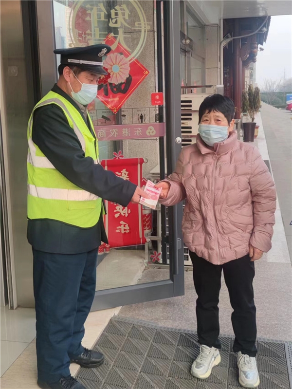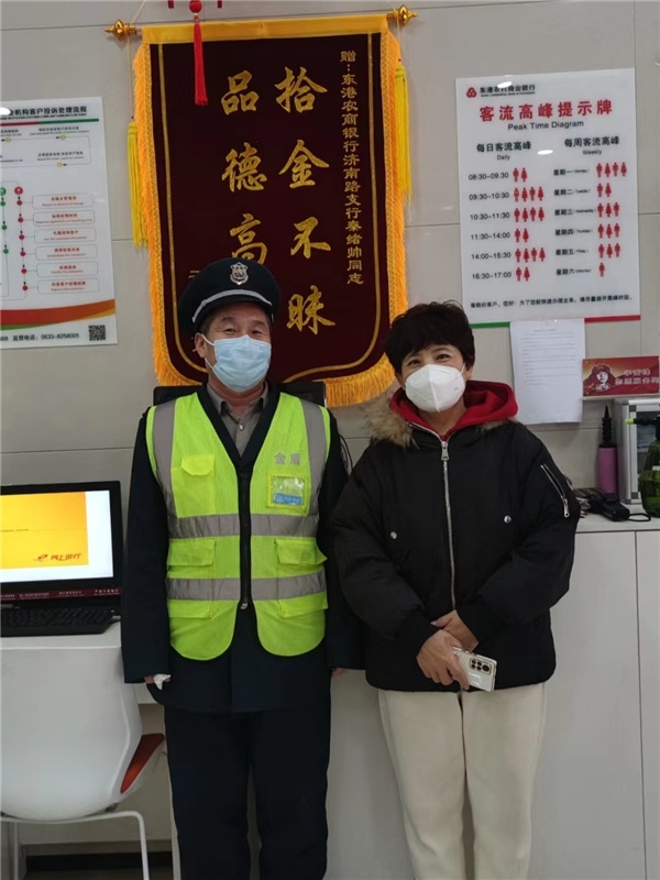 2023年1月31日下午4时,东港农商银行济南路支行保安秦绪帅在营业大厅内外巡检时,发现厅外一辆电动车筐上放着整整一沓人民币,在现场等候十多分钟后,仍不见有人前来认领。担心来往人员较多,保安立即将钱先收起,一边询问询问营业厅内等待办理业务的客户是否有丢失现金,一边将情况向支行负责人进行了报告。