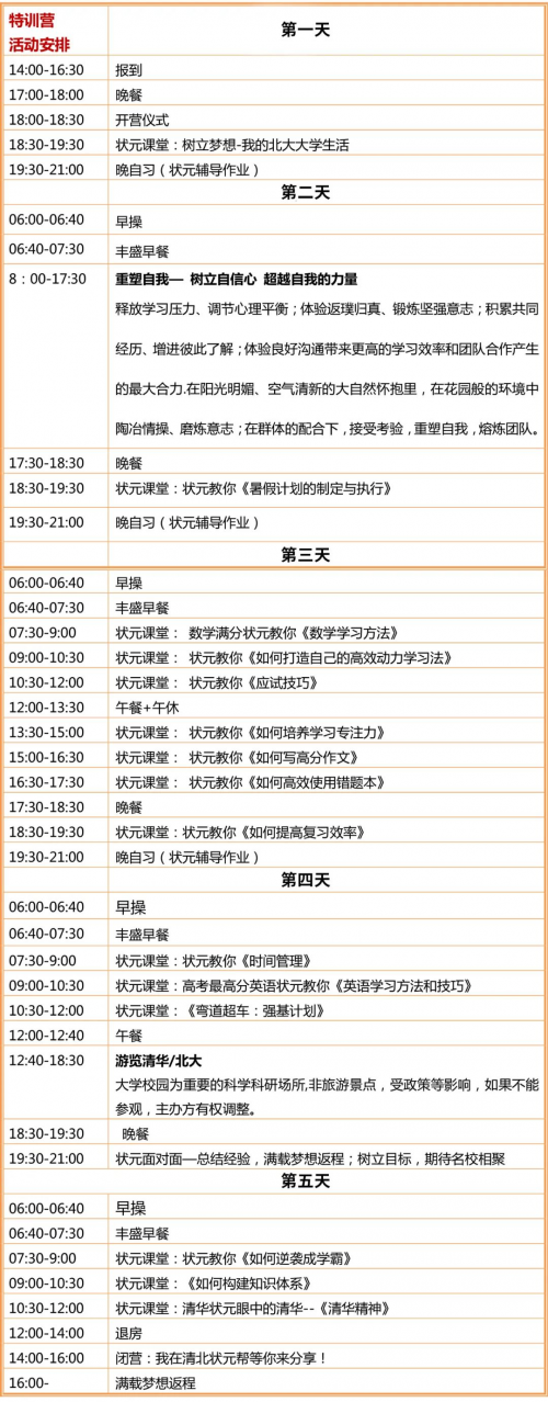 一、梦想 与状元同行,圆名校梦想!状元导师,榜样力量!让学生树立名校梦想,找到自己学习的目标,从而激发学生内驱力,给学生注入持之以恒的学习动力。 二、励志 讲述清华、北大状元自己鲜为人知的求学过程,他们如何从学渣逆袭成学霸考上清华、北大。让我们学生知道:坚持梦想,不断努力,创造奇迹! 三、学习方法 悟出自己的 “学习动机、学习兴趣和学习目标”,好的学习方法事半功倍!让学生掌握每科学习方法及解题思路,找到适合自己的学习方法。 四、学习策略 掌握清华、北大“高考状元”的学习策略,体验快乐、轻松、高效的学习模式,转变学生努力而不得要领的学习状态,化解被动学习、盲目补习的教育痛点,让“学”变的“势如破竹”! 五、应试技巧 提高考试效率,在规定时间内合理分配考试时间及掌握各科答题技巧!会学不如会考!会考比会学重要。做一个合格的批卷老师眼里的“好”学生! 六、学业规划和“强基计划”招生政策解读 高考不是唯一的独木桥,如何弯道超车?向学生介绍国内各大学特色和各省招生情况,学科专业分类,录取分数线和报考技巧,让学生对大学有深入的了解,不再为选大学和专业而困惑。 七、目标管理 “凡事预则立,不预则废”,高效学习从目标开始,明确求学目的,制定学习方案,做好时间管理,才能确定求学之信念。只有明白了学习的目的,才能有一种不畏困难、至大至刚的浩然之气,才会让学习过程始终充满渴望与坚定。 八、重塑自我:树立自信心 超越自我的力量 释放学习压力、调节心理平衡;体验返璞归真、锻炼坚强意志;积累共同经历、增进彼此了解;体验良好沟通带来更高的学习效率和团队合作产生的最大合力.在阳光明媚、空气清新的大自然怀抱里,在花园般的环境中陶冶情操、磨炼意志;在群体的配合下,接受考验,重塑自我,熔炼团队。 清北状元学习方法(寒假)营 开营地点 北京 收费标准 费用:9800元(培训费、学习用具、资料、书包、礼品、保险费、食宿等) 报名细则 (1)报名时间:从即日起到至营满(每班60人); (2)全程军事化管理:每期配2-3位教官; (3) 状元全程伴读:每期不低于2名状元; (4)查漏补缺:学生可带作业,晚自习或课余时间状元辅导; 开营时间 26期:7月4日—8日;27期:7月11日-15日; 28期:7月18日-22日;29期:7月25日-29日; 30期:8月1-5日,31期:8月8-12日, 【注】所有参与学校或地区必须在每期开营前一周,将所有确定参加特训营的报名 表传真或电子邮件到“清北状元帮”特训营组委会备案、确认。 课程安排