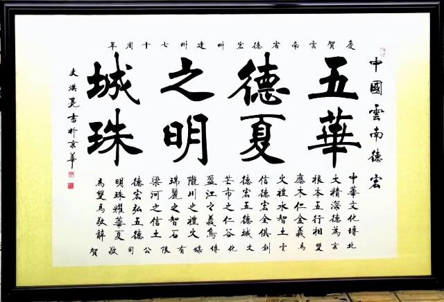 ![]() 图:剧组为电影布景创作的书法道具 2023年1月30日至2月15日,《石来转运》创作团队在全国各行业复工复产大环境下,再次赴德宏州进行采风,力争“深加工”出一部既能让观众喜闻乐见、又能让拍摄地受益,有影响力的“爆款”影视作品。通过实地深入考察,剧组成员认为德宏州是“五德之城、华夏明珠”,其下辖五个县市,玉之“五德”与各地特色文化完美呼应: ![]() 图:出品单位为德宏建州七十周年赠送书法作品 一、芒市之“仁”谷 芒市遮放镇之贡米,被誉为“净如翡翠白似玉生自南国举无双”的粮中珍品。生成于唐,声名于明,古时进贡,发展至今。 ![]() 图:遮放贡米 二、盈江之“义”鸟 盈江县犀鸟谷之犀鸟,国家一级保护动物,雄鸟特别顾家。它们有种习性,当它们失去伴侣时,就不吃不喝,在空中不断地鸣叫,不停地飞,直到最后活活饿死或累死,人们称之为“爱情鸟”。 2023年,犀鸟入选为德宏州建州七十周年吉祥物。 ![]() 图:吉祥物德宝和宏宝 三、陇川之“礼”火 陇川县有“中国目瑙纵歌之乡”之称,目瑙纵歌节是景颇族最盛大的传统节日,数万人踩着同一个鼓点起舞,在世界上规模最为宏大,最具震撼力的舞蹈,素有“天堂之舞”之称。 ![]() 图:目瑙纵歌万人齐跳一支舞 ![]() 图:中华民族像石榴籽一样紧紧团结在一起 四、瑞丽之“智”石 瑞丽市是全国最大的翡翠毛料批发集散地,五洲客商云集至此,自古能看懂璞玉的相玉者都代表智慧的象征,这也是一种独具魅力的文旅优势。 ![]() 图:智慧之石--智者点石成金 ![]()