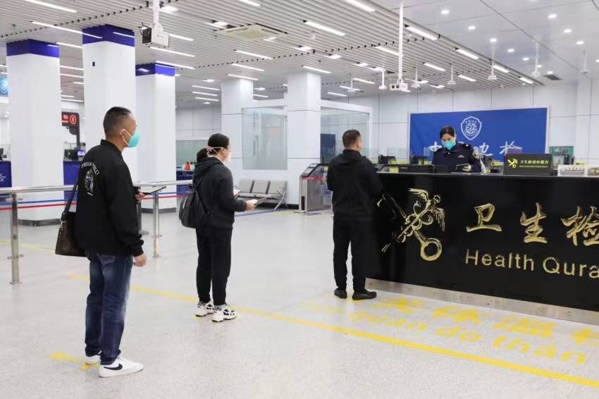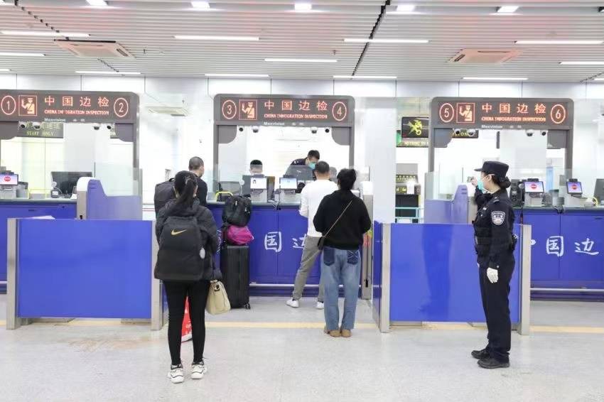 当天,出入境业务大厅迎来了久违的“热闹”,前来办理出入境手续的旅客不断,工作人员正在为旅客办理出入境手续,接取证件、人证对照、查看证件、资料录入、加盖验讫章,旅客们很快就完成通关手续。