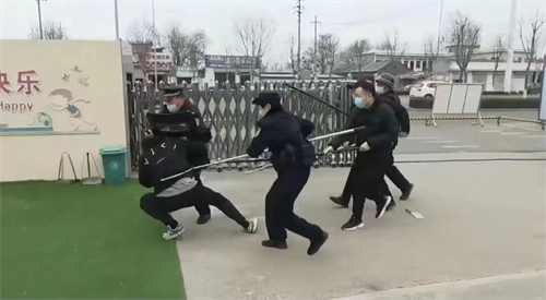 建设派出所曹令金队长首先对学校安保人员进行了反恐防暴知识讲解。接着,他为大家演示了安保器械的正确使用方法以及在擒拿格斗中的自我防护等多项内容,并对安保人员进行了实操培训。模拟实战演练前,曹令金队长讲述了出现险情时各人员器械的站位,以及应该注意的事项。演练中,“歹徒”试图冲进校园,欲对校园内师生实施伤害。参演人员立即采取行动,利用刚学到的防御知识进行控制,最后成功制服了“歹徒”,取得了良好的演习效果。