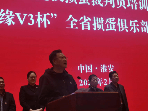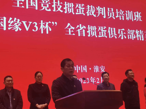 一是高技术对决。全省掼蛋俱乐部精英赛有38个掼蛋俱乐部共152名运动员参赛。这些运动员都是各俱乐部精挑细选推出的最优秀选手,可谓巅峰对决、旗鼓相当,体现江苏掼蛋的最高水平。本次比赛对于打造体育赛事品牌,推动掼蛋运动逐步由群众体育走向竞技体育;培育全省掼蛋俱乐部健康、规范、高质量发展,引领掼蛋运动高峰前行,具有重要的积极意义和现实意义。 二是高水平执裁。为了规范、引导掼蛋运动健康发展, 国家体育总局棋牌运动管理中心不久前颁发了《竞技掼蛋竞赛规则(试行)》;全国掼蛋裁判员培训班又以本次全省掼蛋俱乐部精英赛为实践平台,参加执裁实践的是来自全国各地40多名掼蛋裁判员培训班学员。执裁队伍水平之高、队伍之大、要求之严格,在掼蛋运动发展史上是空前的。 三是高质量融合。江苏今世缘酒业股份有限公司,是江苏乃至全国知名的高品质酒企,“今世有缘,今生无悔”,“追求卓越,缘结天下”的今世缘精神,映射出中华民族独具特色的人文个性与时代愿景。我们与今世缘集团多次合作,成功举办过江苏首届掼蛋精英赛、海峡两岸掼蛋联谊赛以及影响海内外的重大赛事,通过掼蛋活动扩大了高质名企的影响力。这次以今世缘酒业冠名的“国缘V3杯”全省掼蛋俱乐部精英赛,是双方在跨界融合发展上的再合作、再尝试,必将结出经济效益和社会效益双赢的丰硕成果。 四是高风格展示。本次精英赛,参赛运动员都是全省各掼蛋俱乐部精心选拔出来的,技术过硬,素质较高,体现的是俱乐部整体素质。希望各位运动员在比赛过程中,顾全大局,遵守纪律,服从裁判,赛出风格、赛出友谊、赛出水平,展示江苏掼蛋运动员队伍良好的精神风貌。 江苏省掼蛋协会副会长单位、本次精英赛冠名方、江苏今世缘酒业股份有限公司全国人大代表、党委书记、董事长、总经理顾祥悦先生致辞。