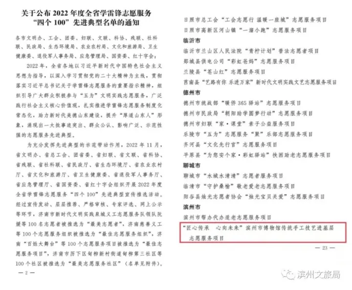 近日,在山东省文明办、省总工会等单位联合举办的全省学雷锋志愿服务“四个100”先进典型评选中,滨州市博物馆申报的“匠心传承 心向未来”传统手工技艺进基层志愿服务项目成功入选最佳志愿服务项目。 ![]() 此前“匠心传承 心向未来”志愿服务项目已经荣获滨州市2022年度学雷锋志愿服务“四个10”先进典型选树活动最佳志愿服务项目,本次又喜获省级表彰,彰显出滨州市博物馆志愿服务团队的实力与水平。 ![]()