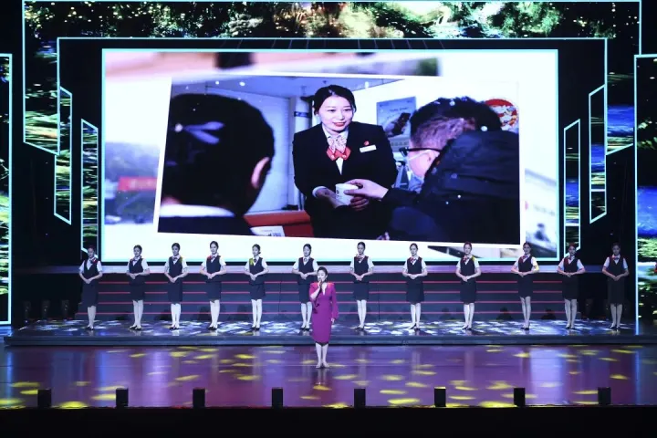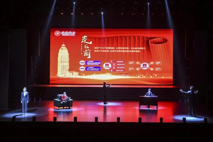 ![]() 活动在开场舞《春潮》中正式拉开帷幕,现场气氛热烈、热闹非凡,奏响了临商银行25年再出发的新春序曲,也拉开了第一篇章《红色足迹》的序幕。《红色足迹》篇章深情再现了25年来临商银行紧跟党的步伐,不忘初心,传承沂蒙精神,团结一心、奋发拼搏的精神。情景舞台剧《我们的时光机》透过老中青三代临商人的视角展现了临商人25年奋进路,诉说着临商银行与时代同行、与地方同兴的不变情怀;《追寻》《跟着共产党走》《我的家乡飞出一首歌》等一首首脍炙人口的歌曲串烧,展现了临商银行干部职工永远跟党走、奋进新时代的精神风貌。 ![]()