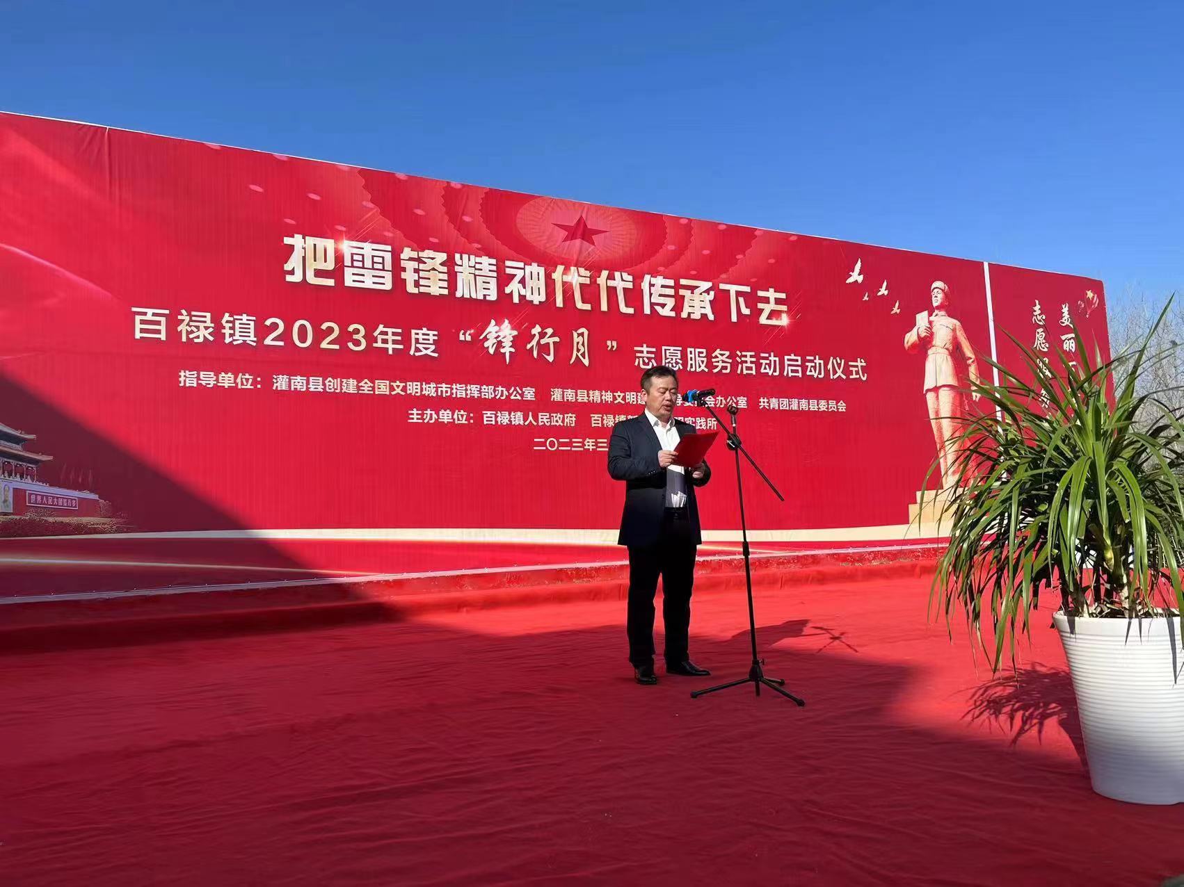为大力弘扬社会主义核心价值观,推动志愿服务行动深入开展,让雷锋精神在新时代绽放更加璀璨的光芒,3月2日上午,江苏省灌南县百禄小学开展“传承雷锋精神,弘扬时代新风——百禄镇志愿者在行动”项目启动仪式。县委宣传部常务副部长徐茂干同志、百禄镇党委书记胥立中同志出席活动。