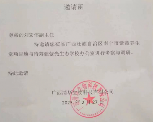 2023年2月27日,应广西清华生物科技有限公司邀请,刘宏伟(合作共建全国生态智慧康养项目办公室副主任)从北京来到南宁市美丽南方紫薇养生堂,考察了拟议中的南宁市美丽南方紫晖智慧生态中等职业技术学校(同时是拟议中的广西紫光科技大学的附属中专部)的办学筹备情况。刘曦(化工机械博士/材料科学与工程博士后,清华大学访问学者,南宁市第八届政协委员,原任百色市质量技术监督局党组成员副局长,广西清华生物科技有限公司科技顾问)陪同考察。