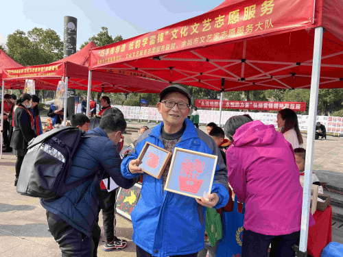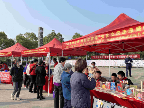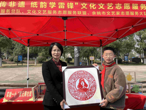 文艺界学雷锋活动现场,由余姚市文联副主席赵红棱带队,14名文艺志愿者,分别来自余姚市民间文艺家协会、余姚市第一实验小学、余姚市特教中心、余姚市江南新城小学和临山镇湖堤小学的师生代表组成的志愿服务队,在广场设置“巧手传非遗,纸韵学雷锋”文化文艺志愿者摊位,包含现场民间剪纸、民间技艺面塑文艺表演和现场义卖,现场展览出民间剪纸一百二十幅、精美的卡通面塑技艺四十多个等丰富多彩的文艺宣传和特色志愿服务项目。宁波市十佳剪纸能手施灵敏和余姚市民间剪纸能手牛晓园、陈荣海等亲临现场,向参加的市民进行传艺。