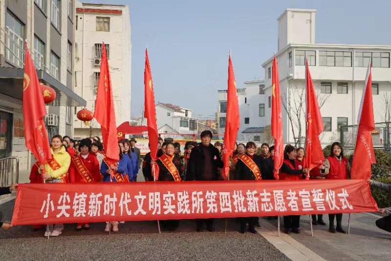 “今天是学习雷锋日,我非常高兴成为江苏省响水县益起来公益协会的一名志愿者,在这个大家庭里,我将和大家一起弘扬奉献,友爱,互助,进步的志愿精神,向社会和他人提供无偿的公益服务,向雷锋同志学习,为促进社会主义文明,践行社会主义核心价值观,努力奋斗。”3月5日下午, 响水县小尖镇周集社区居民花晓芳和另外6个村居的100多名爱心居民,成为该镇益起来公益协会的第四批志愿者,当地党委政府负责同志为朱浦、小广、郭庄等7个村居志愿者服务队授旗,标志着小尖镇新时代文明实践志愿服务工作进入了全新推动、全面实施的阶段。 志愿服务送关爱,文明实践树新风。响水县益起来公益协会是在当地党委、政府的关怀下成立的民间爱心组织,是集慈善公益和文艺宣传于一体的公益志愿服务队伍。去年,共有三批93名志愿者参加了响水县益起来公益协会,他们积极配合小尖镇党委、政府宣传党的方针、政策,学习新思想,初心永不忘。不断创新志愿服务品牌,召集广大社工、社会组织、志愿者广泛开展健康义诊、扶老助残等爱心公益活动,不断拓宽服务领域,打通组织群众、凝聚群众、服务群众的“最后一公里”。