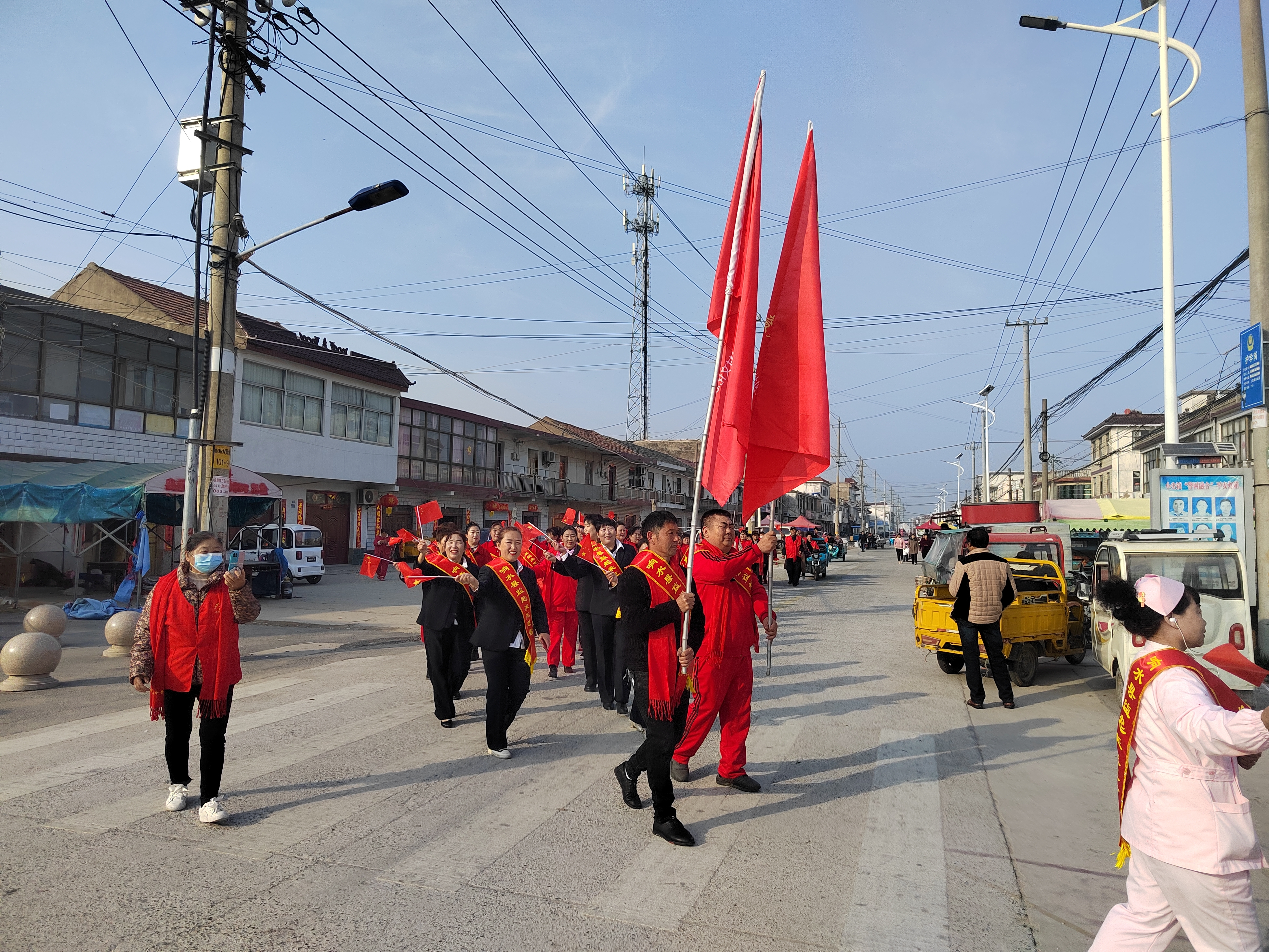 灿烂的笑脸给三月带来了温暖,甜美的微笑给春天带来了生机,快乐的心情让社区充满了活力。3月8日上午,江苏省响水县小尖镇周集社区的街道上彩旗招展,歌声嘹亮,响水县益起来协会、响水县聚贤养老协会的妇女姐妹们身穿志愿者红马甲、肩披彩带、手持小五星红旗,满面春风地走来,引起了街上市民的观望。
