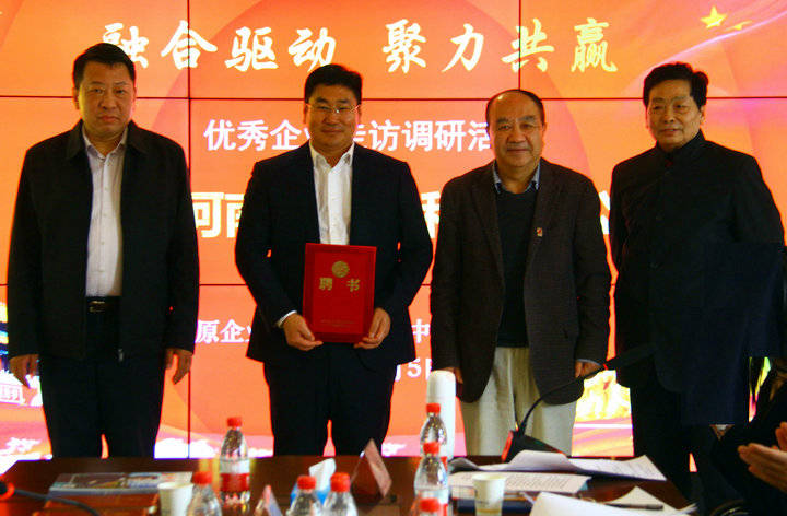中原企业家智库秘书长李信华(右一)向于保军颁发《聘书》 在与会全体人员的热烈掌声中,中原企业家杂志、智库高级顾问赵志正,将“中原企业家智库常务理事长单位”的牌匾授予河南四建工程有限公司董事长于保军;同时,中原企业家杂志社长、总编,智库秘书长李信华也向于保军颁发了“中原企业家智库常务理事长”的《聘书》。