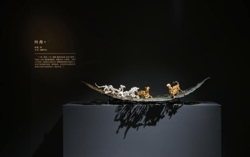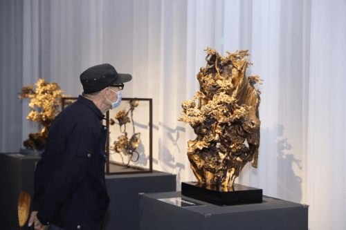 朱炳仁作品《木幻生金系列》 “一汪金水,终成图画”,本次展览分为“同源”“蕴生”“不息”三部曲,如一幅长卷,将朱炳仁创作之路徐徐展开,呈现熔铜艺术的“饕餮盛宴”。 活动中,朱炳仁与其子浙江省工艺美术大师朱军岷一起,带领参观者一起领略铜的洗礼与新生。 从熔铜艺术的经典之作到2022年的最新探索,展品包括长达8米的博鳌亚洲论坛会场的同款壁画《万泉归海》,以王希孟“青绿山水第一神品”为灵感的《千里江山》。其中还包括最新的抽象创作《叶舟》《香味与花》,以及首次公开展出的庚彩作品《天青御风》《庚彩铜牛》,在朱炳仁的手中,山林、水泽、鸟兽,皆可由铜所化,天地无限,造化无穷。